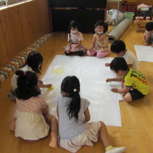 紙を繋げて、大きくしていると「なんだ~?なんだ~?」とわくわくの子どもたち。
