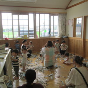 ひよこ組さんは、ダイナミックに新聞あそびを楽しんでいました♬