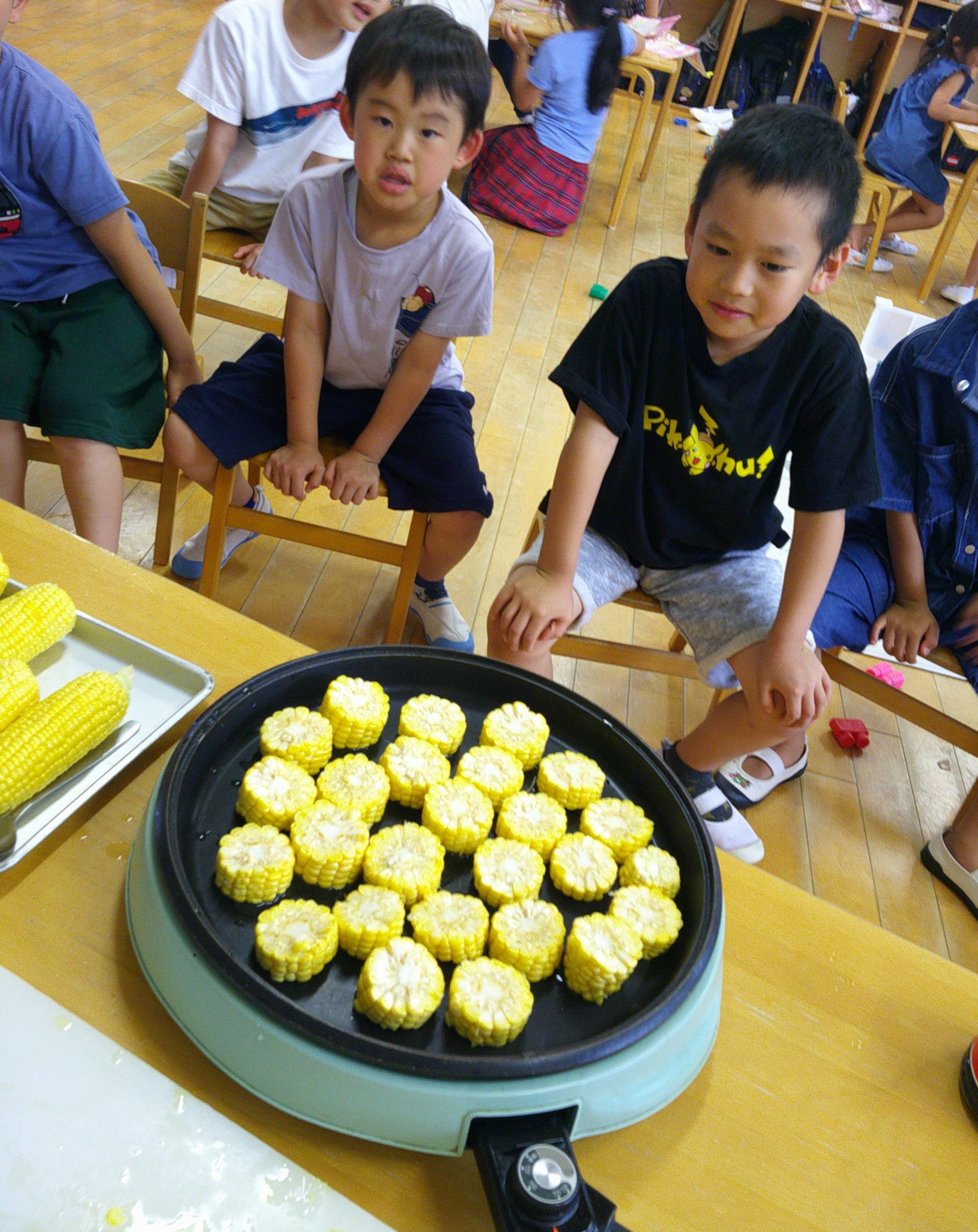 ホットプレートの上で、調理されるとうもろこしを嬉しそうに見つめる子ども達です😄