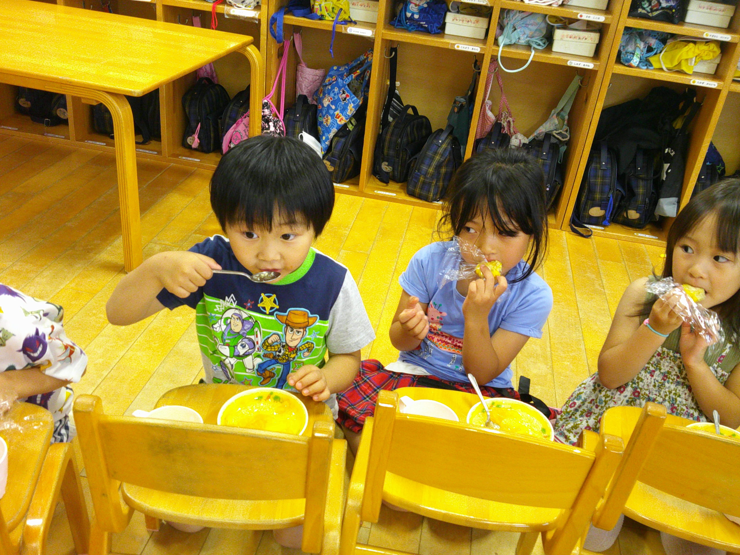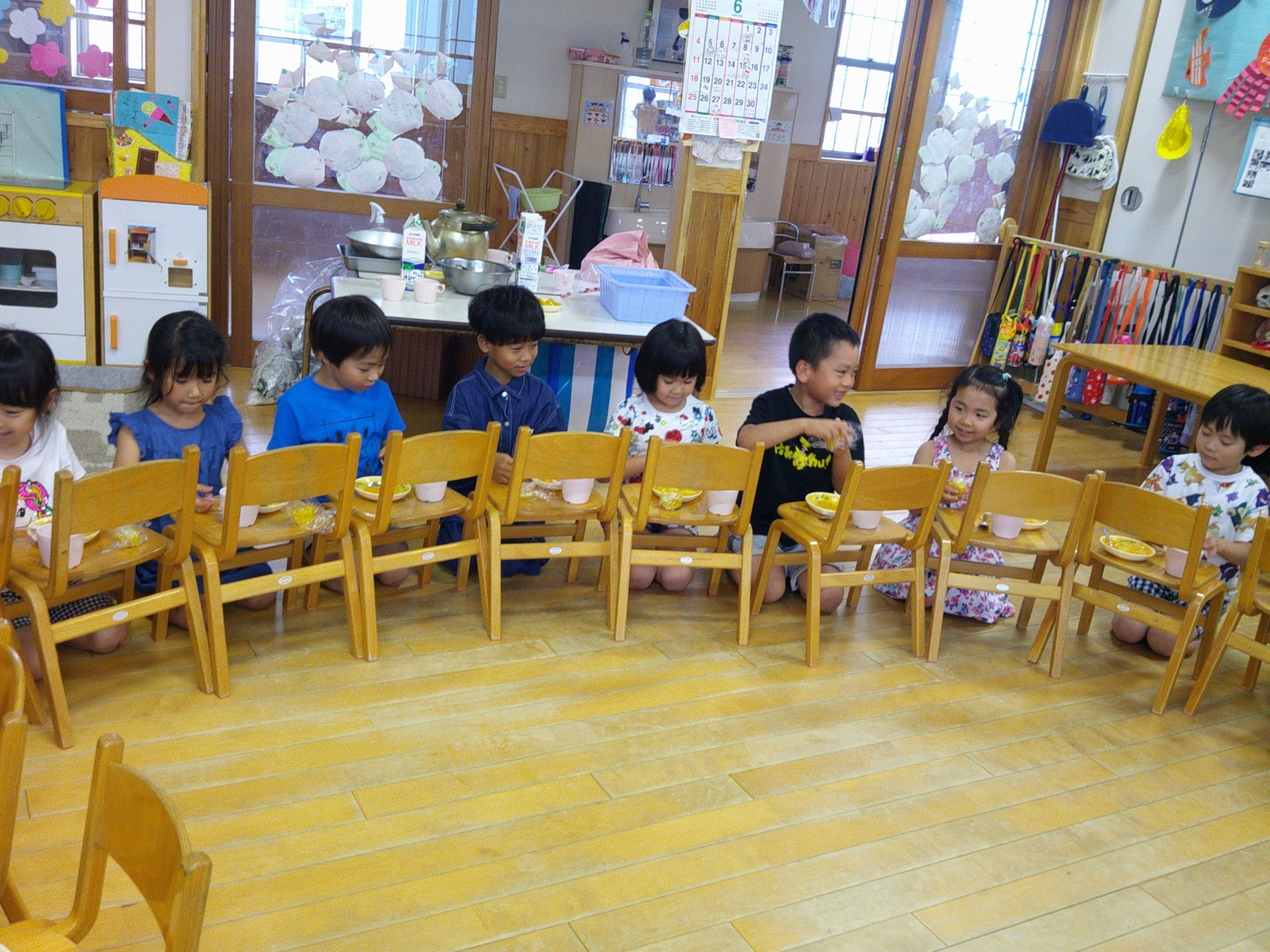 しょうゆとみりんで香ばしく焼きあがった焼きとうもろこしを、みんなで輪になっておやつのみかんゼリーと一緒に食べます😄