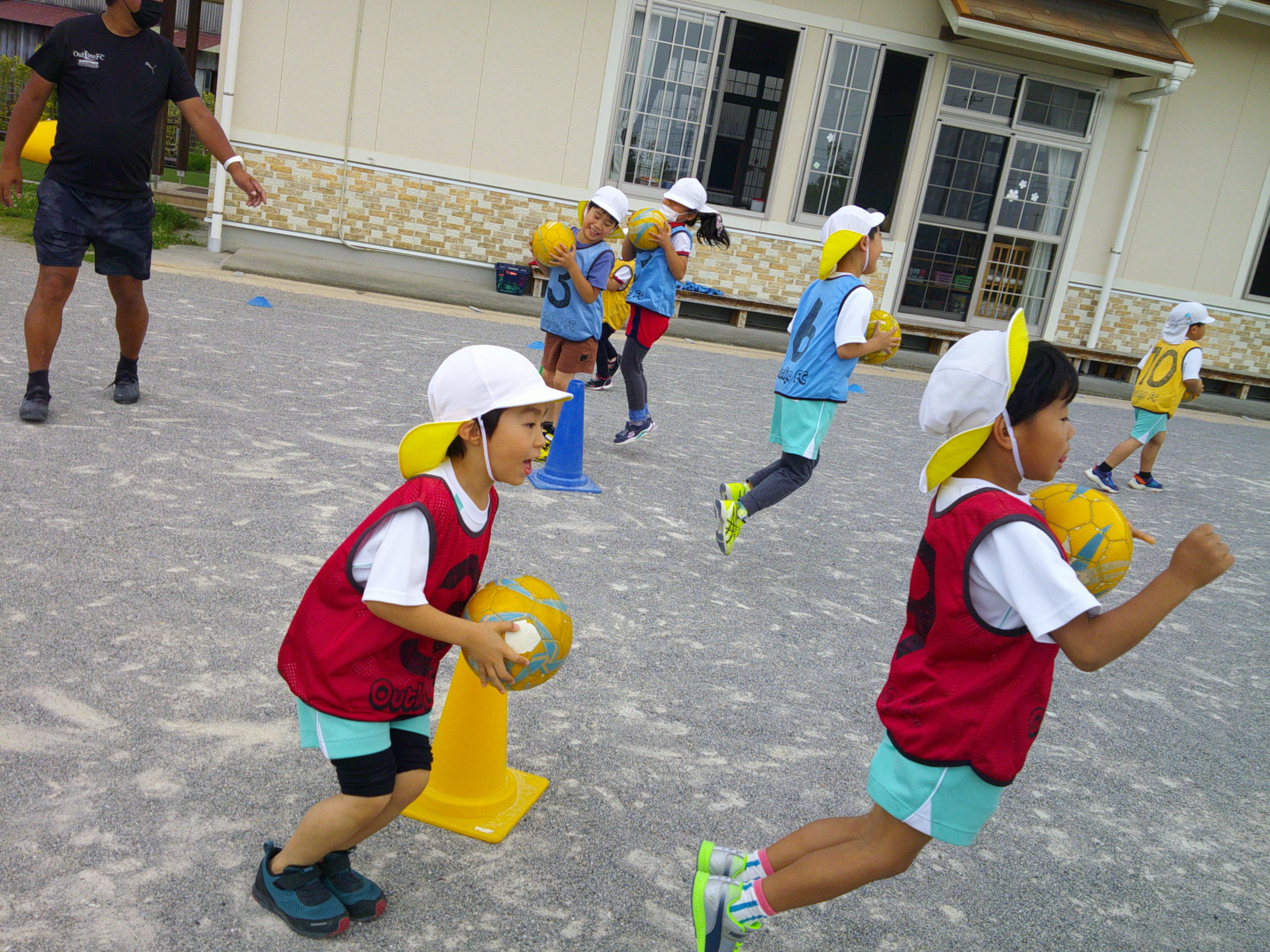今日のサッカー教室は、まずはボールリレーからスタート!