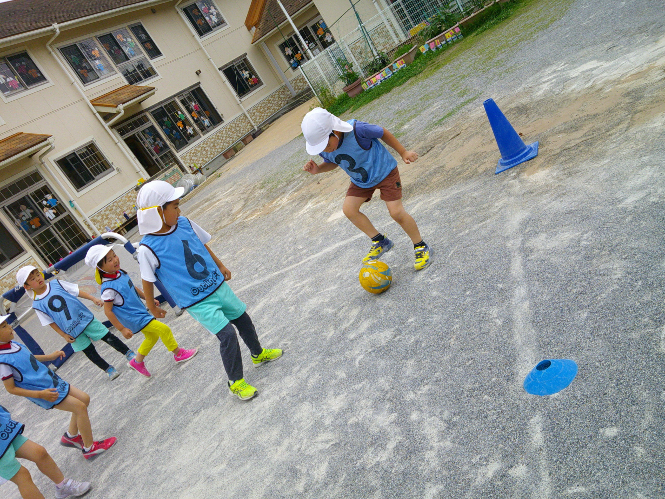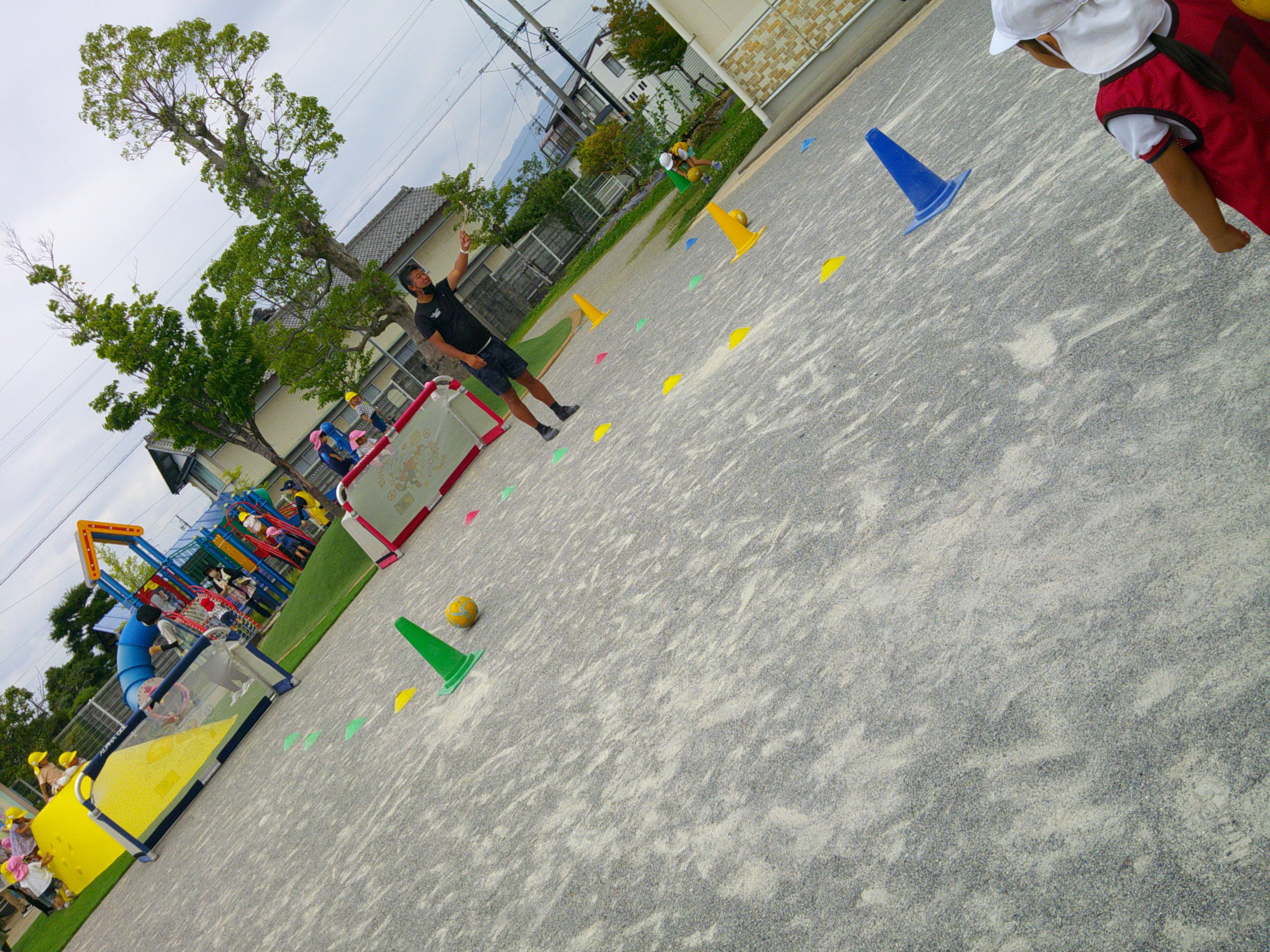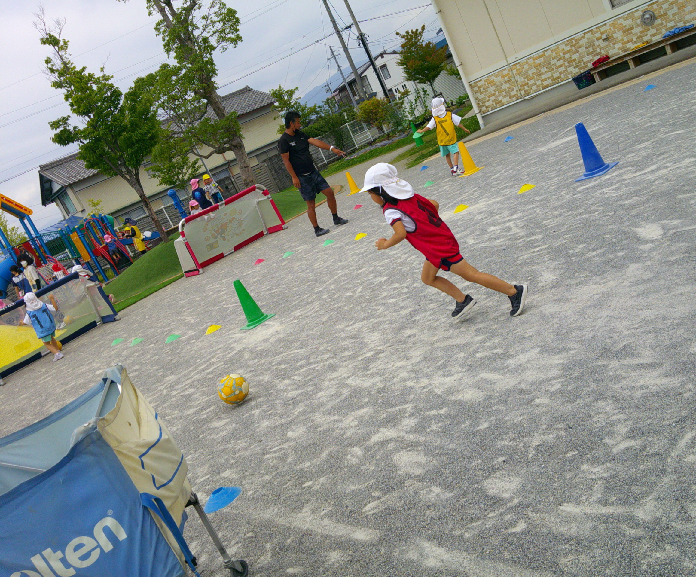 ボールを蹴る姿が一段とたくましくなった3回目のサッカー教室。汗を沢山かきながらも、とても楽しそうな子どもたちでしたよ😆保育室に戻り、「今日のコーンを倒したシュートかっこよかったよね💖」「転んだのにさ、すぐボールおいかけてくとことか、かっこよかったぁ💖」と嬉しそうに話す保育士に、照れ笑いを浮かべつつ、お着替えタイムを過ごす子ども達でした♡
