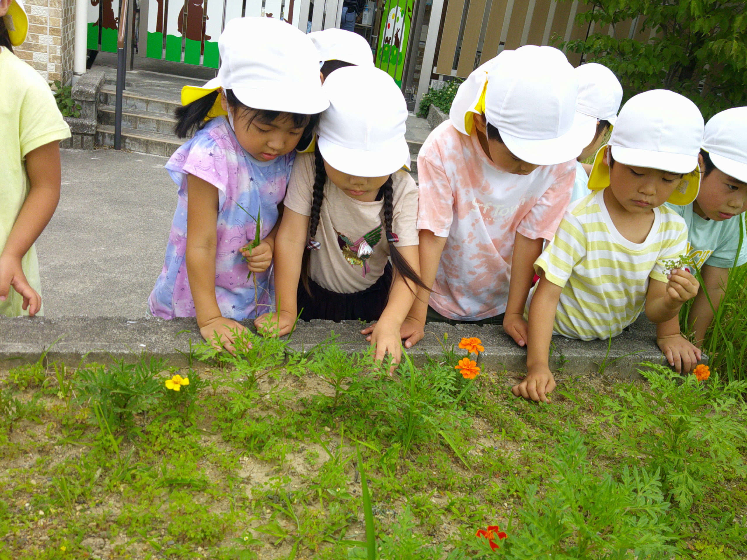 雨が降る前に、咲きはじめたマリーゴールドの花壇の草むしり😊可愛いお花を傷つけないように、そっと草を抜いていきます。草むしりをしている間にも、日常の出来事をワイワイ話すぞうぐみさん。
