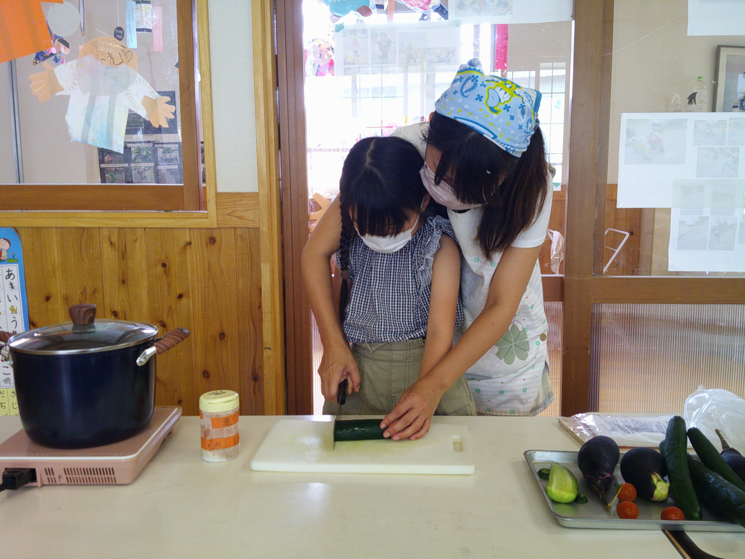 畑で収穫したきゅうりとなす!保育士と一緒にきゅうりを切ります😄