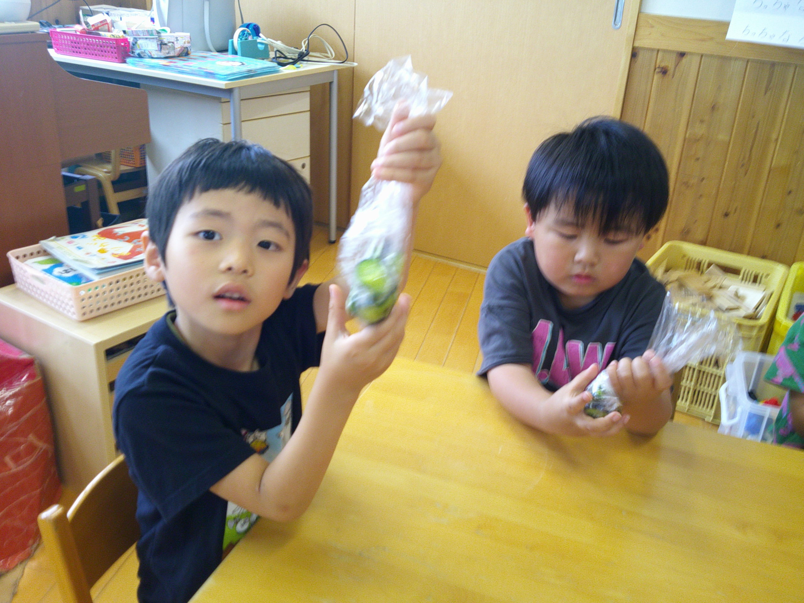 子どもたちと切ったなすときゅうり、塩をビニール袋にいれて自分たちでモミモミ😄