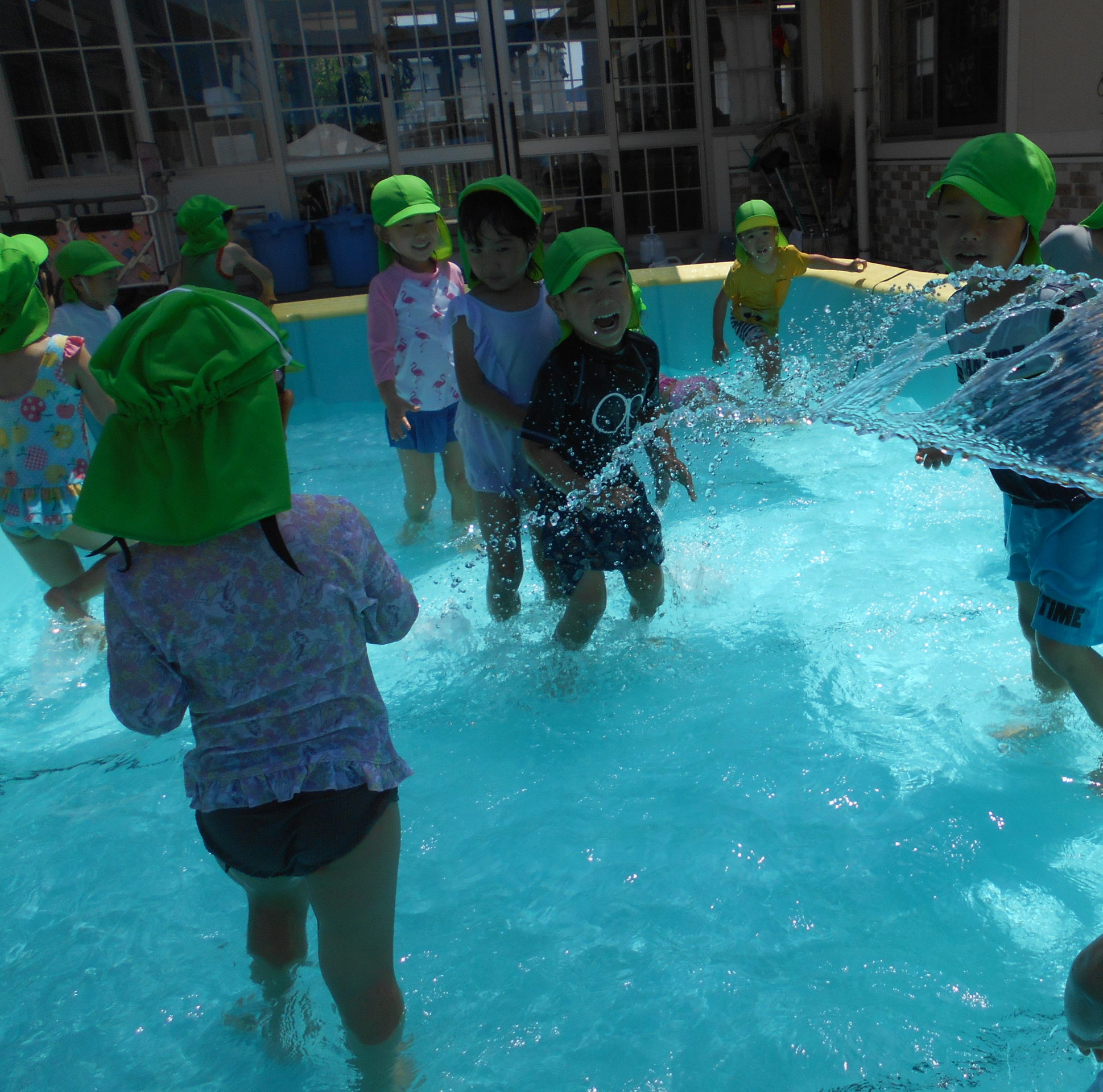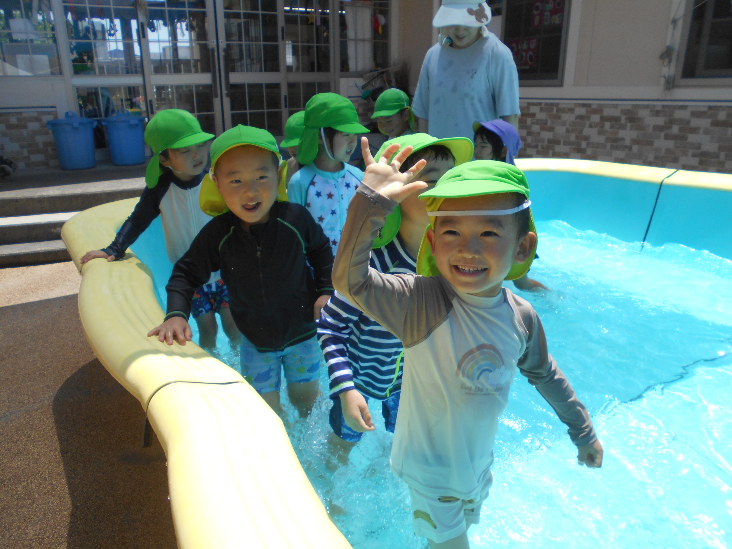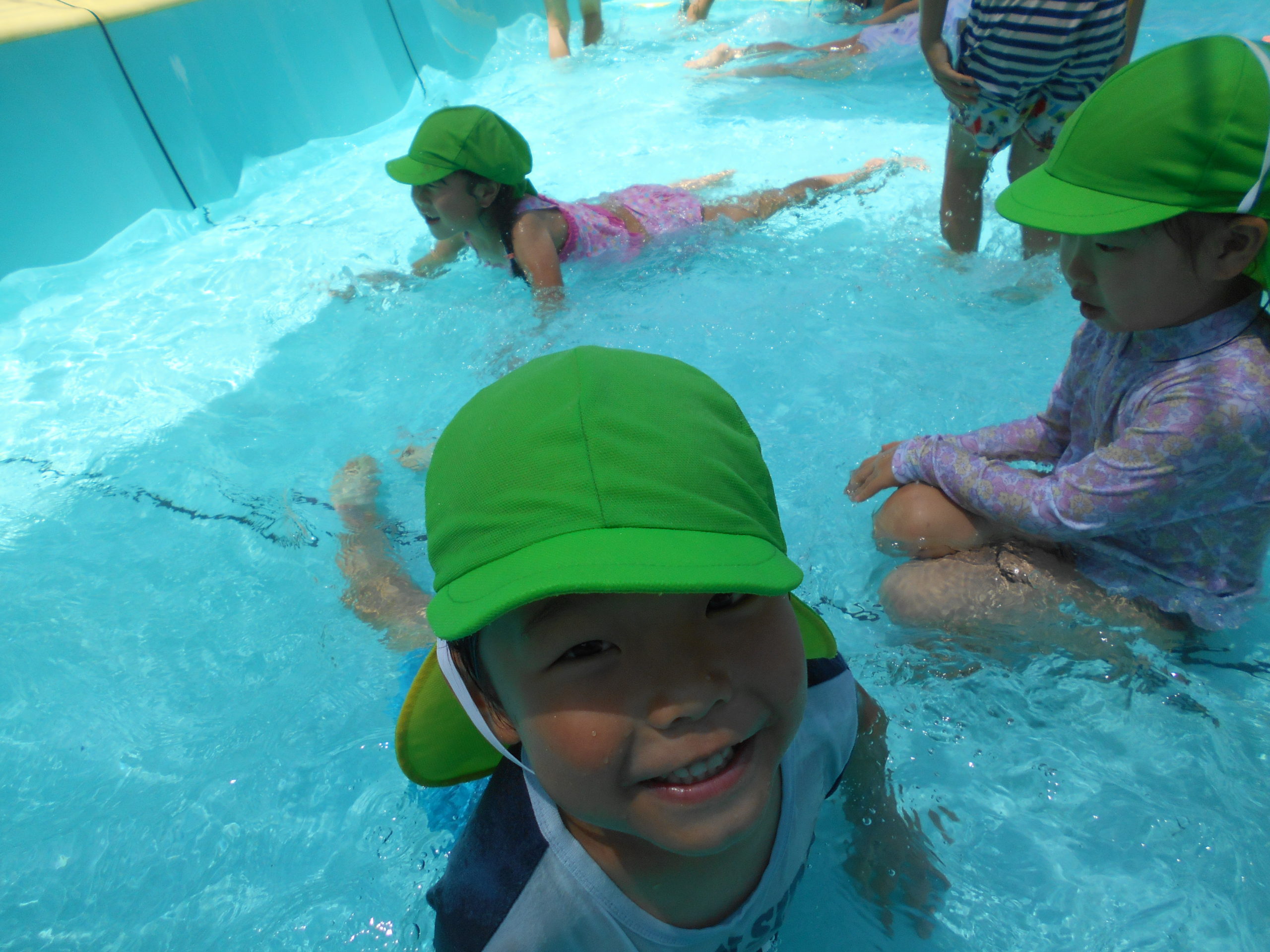 プールに水が入っていることを玄関で見てきたのか、「せんせい!今日ってプール入る?はいるよね?」と朝から目を輝かせて聞いてくれた子どもたちでした。