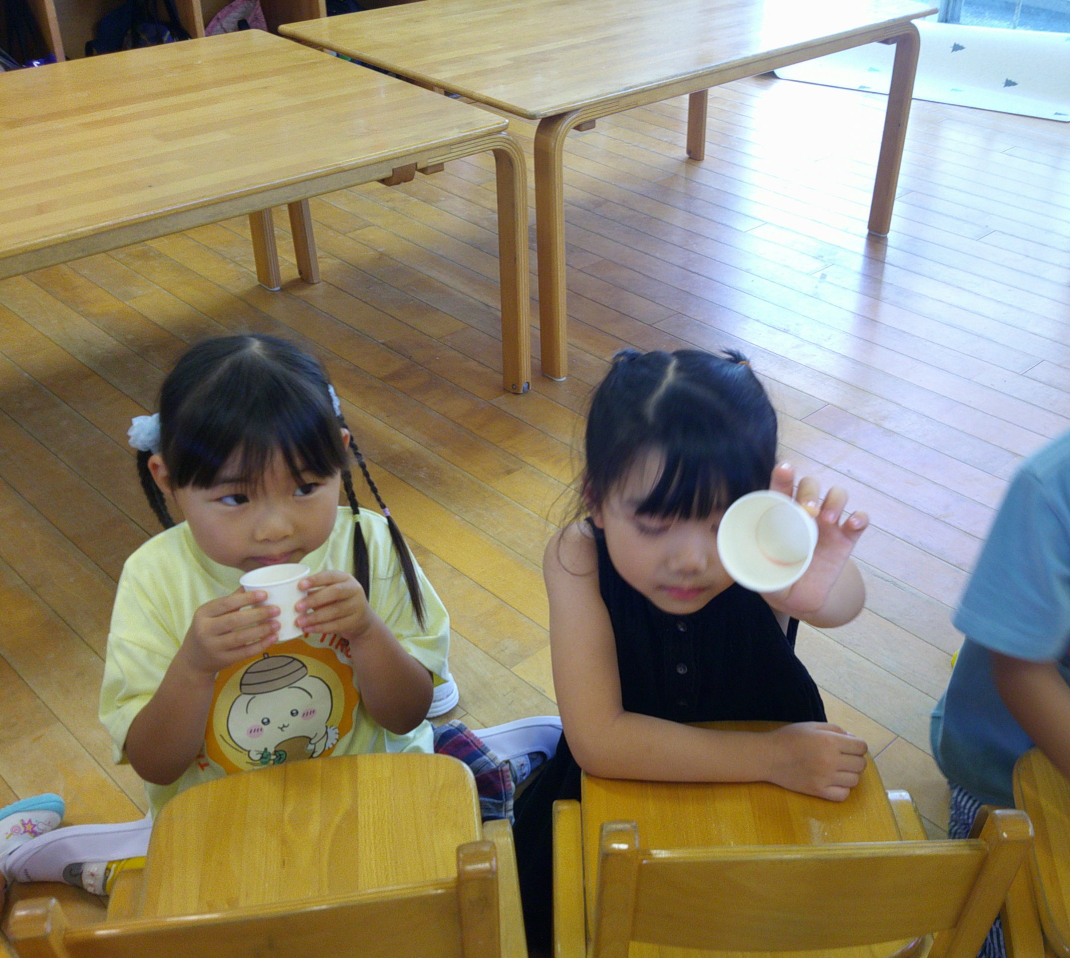 「サイダーで割ったけど、飲める?」と心配する保育士の前に、コップをズイッ😳空になったコップを見せてくれました😊