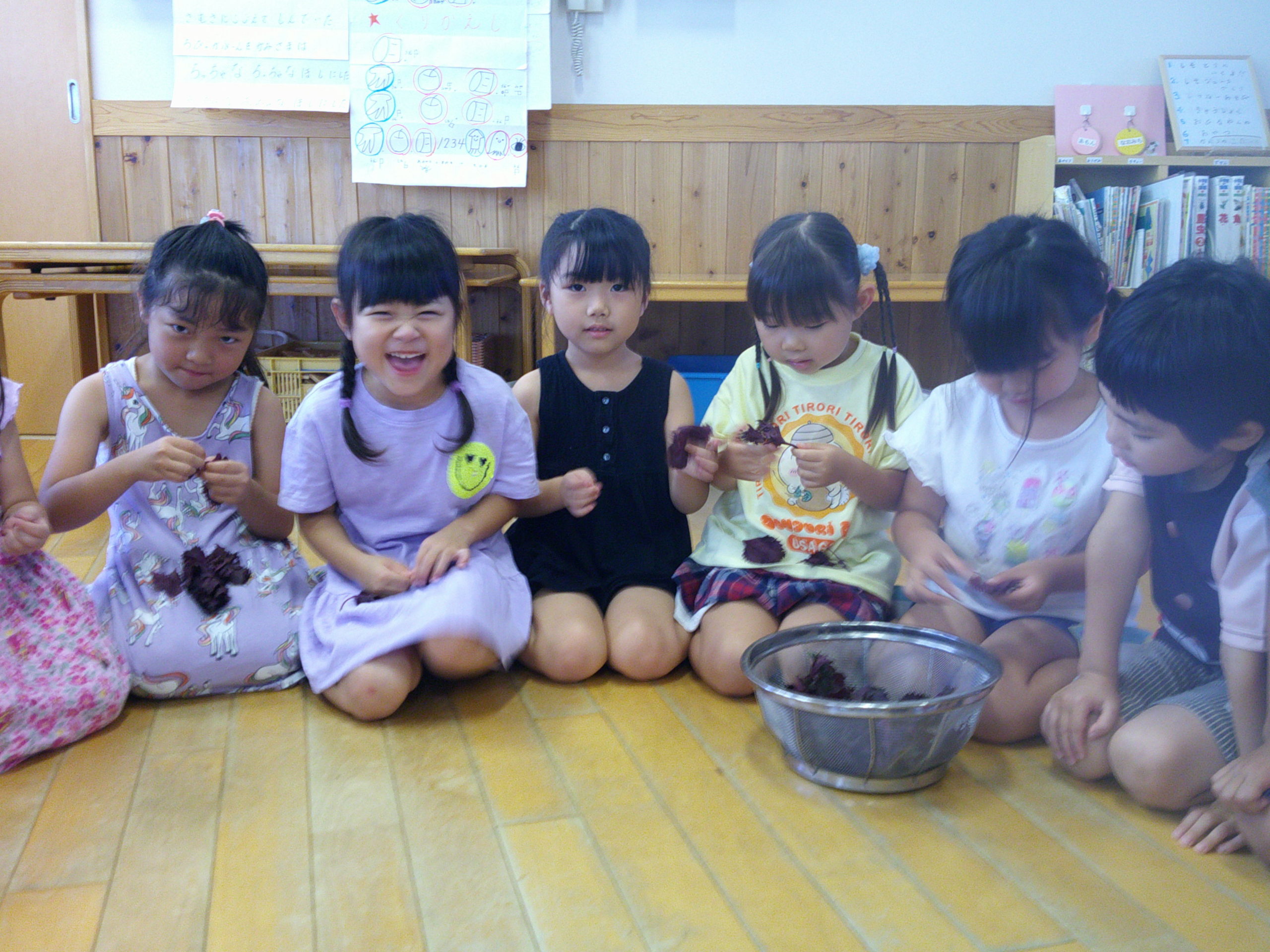 今日は、園庭のプランターで収穫できた赤しそを使い、しそジュースを作りました😄