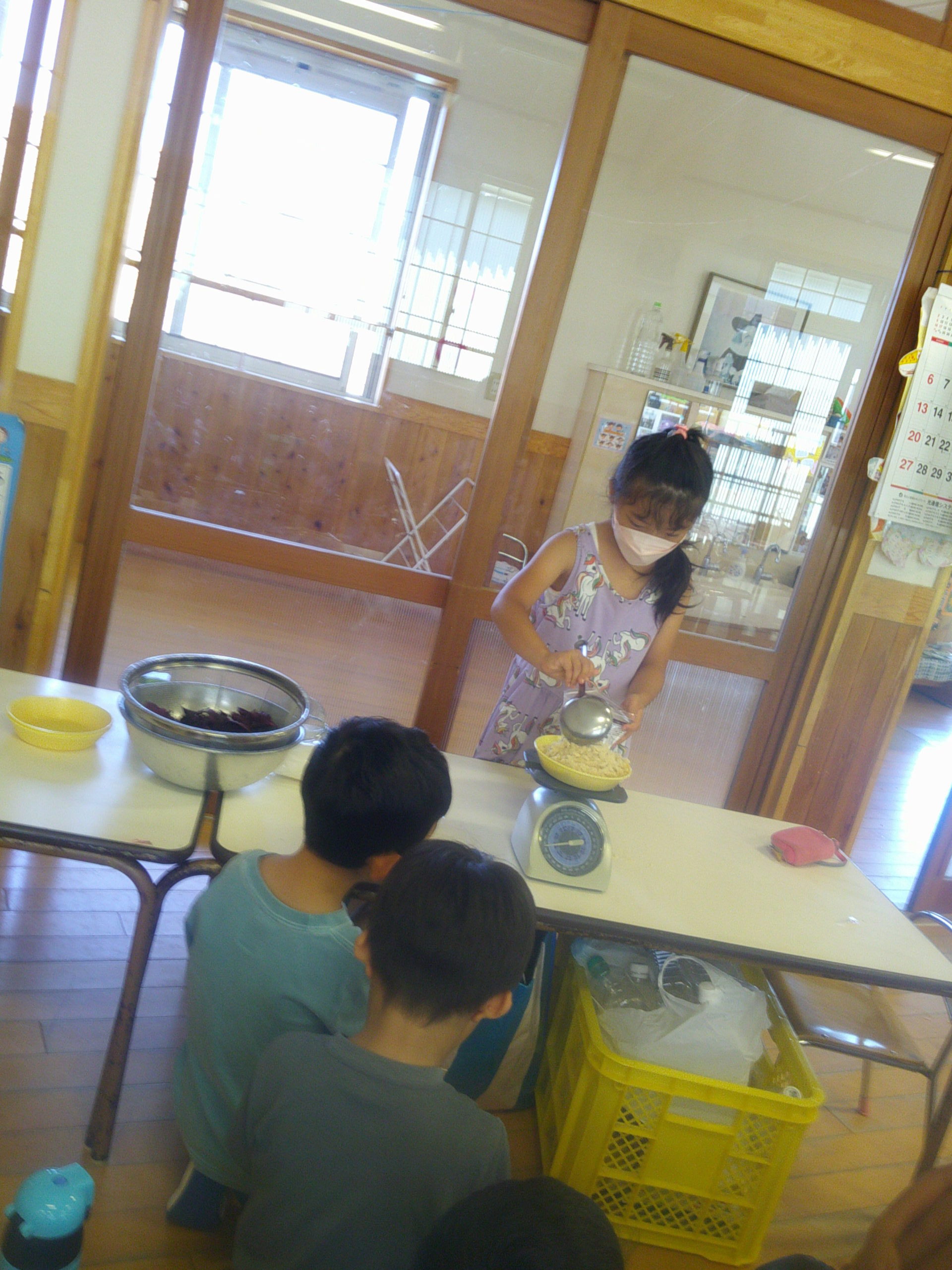 お鍋でぐつぐつ煮る前に、ジュースに使う砂糖とクエン酸を計りではかります😊
