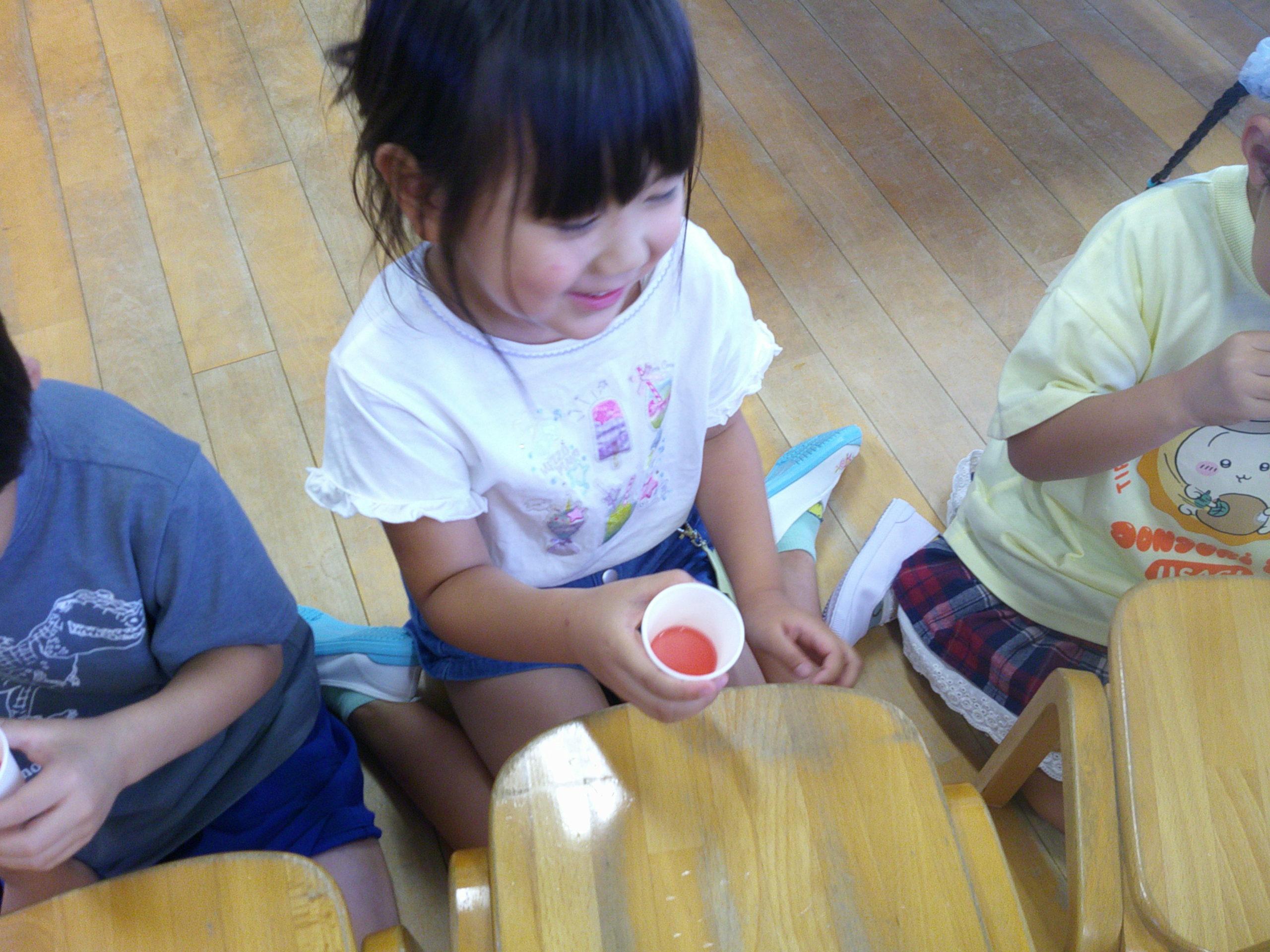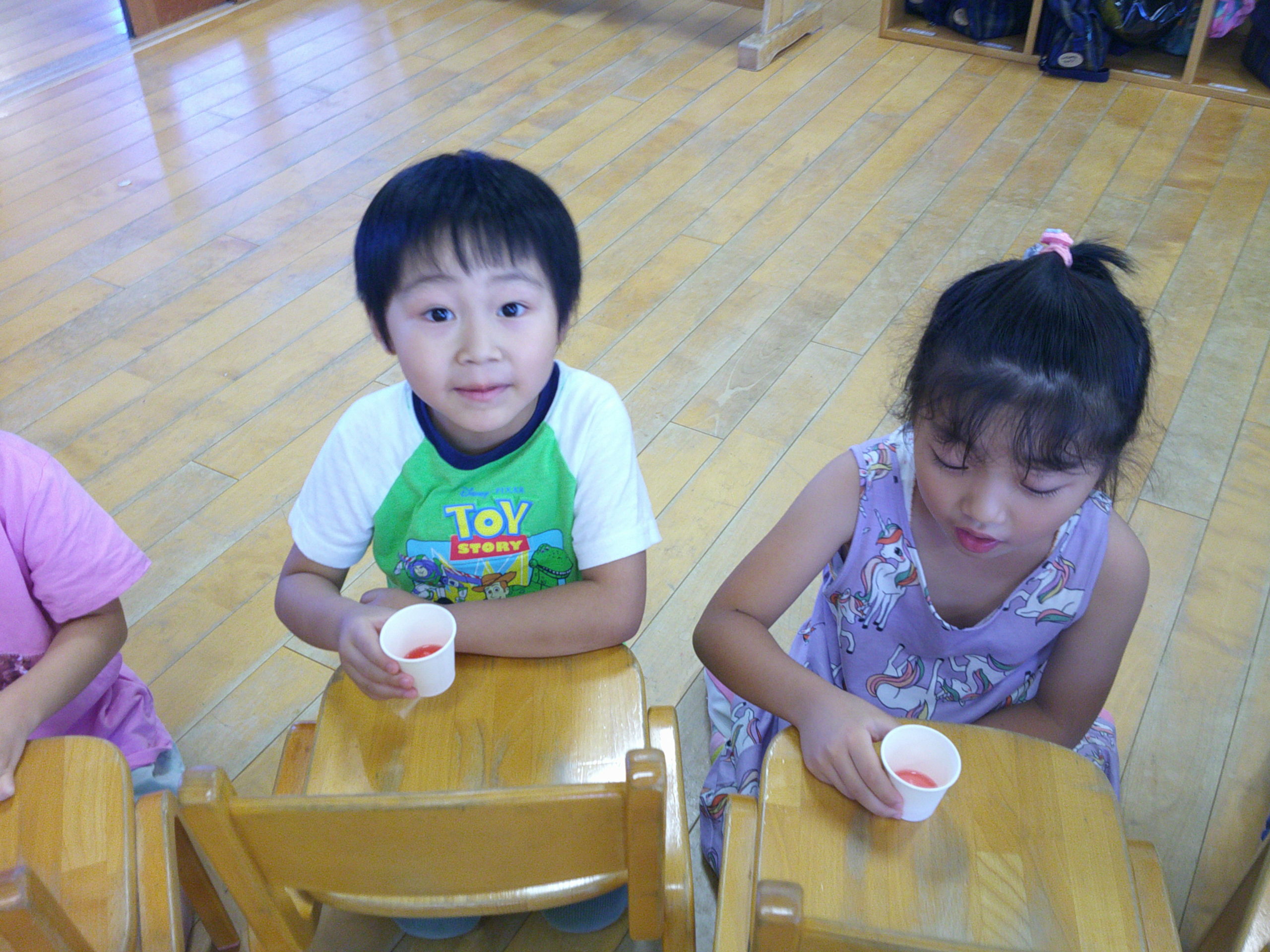 サイダーで割ったしそジュースは、甘くておいしい!はじめてしそジュースを飲む子が多かったですが、みんなとても美味しそうに飲んでくれました😊