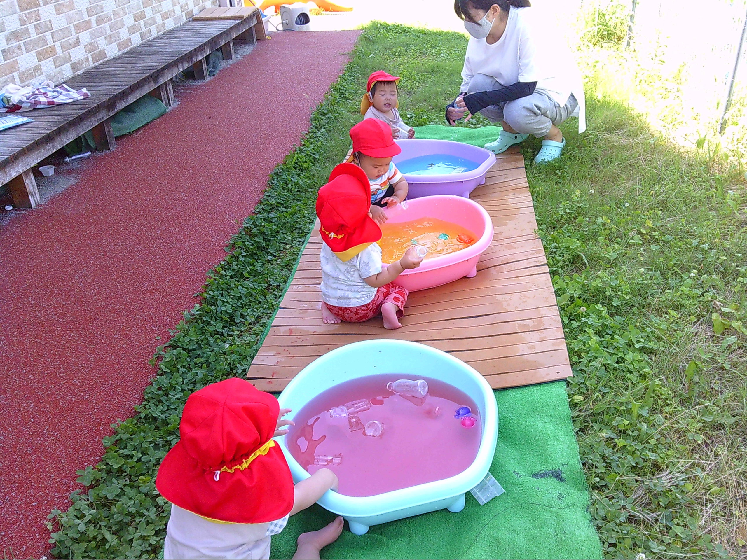 今週は、色水、泡、スライムなど、色々な素材に触れて
