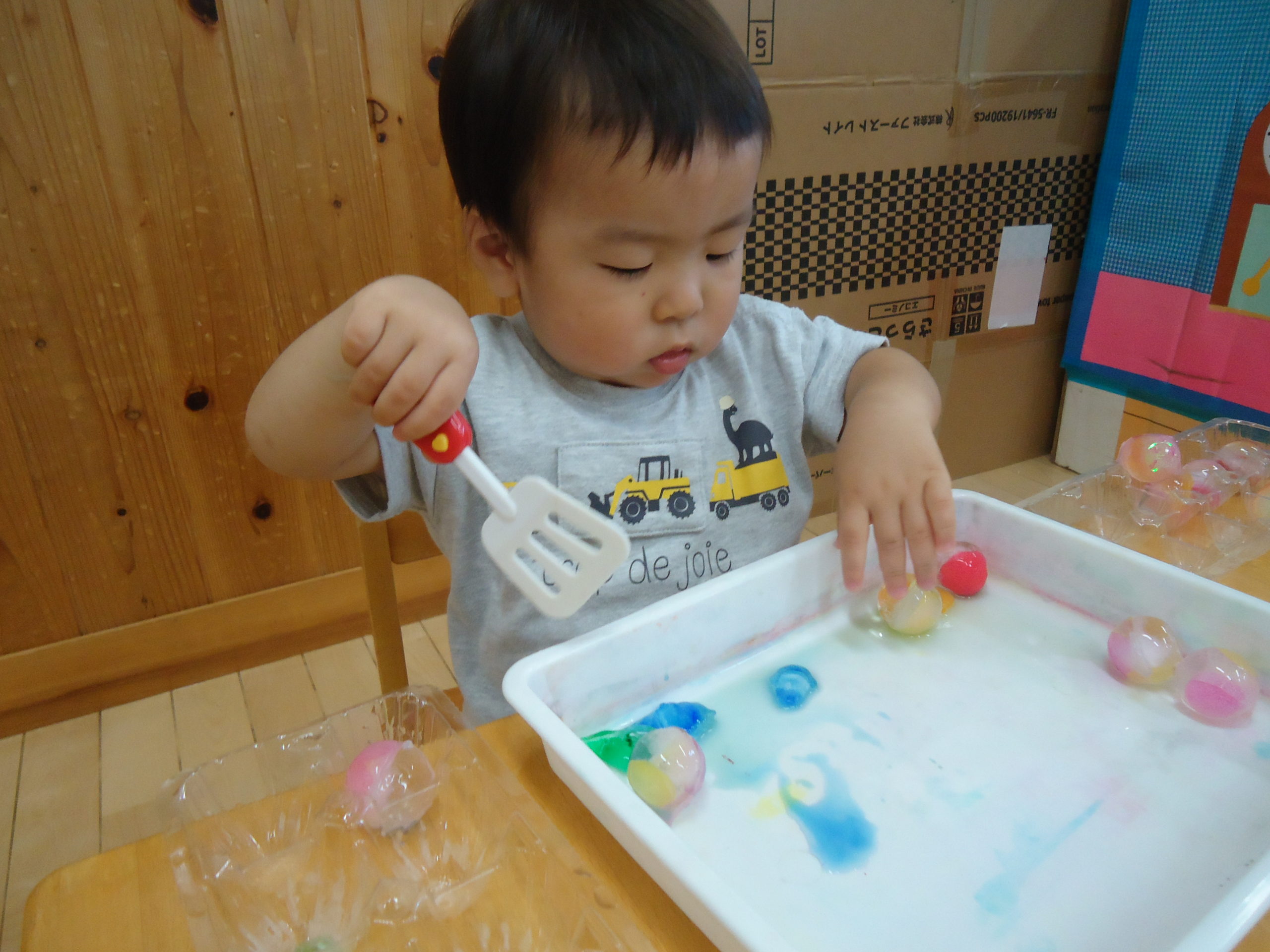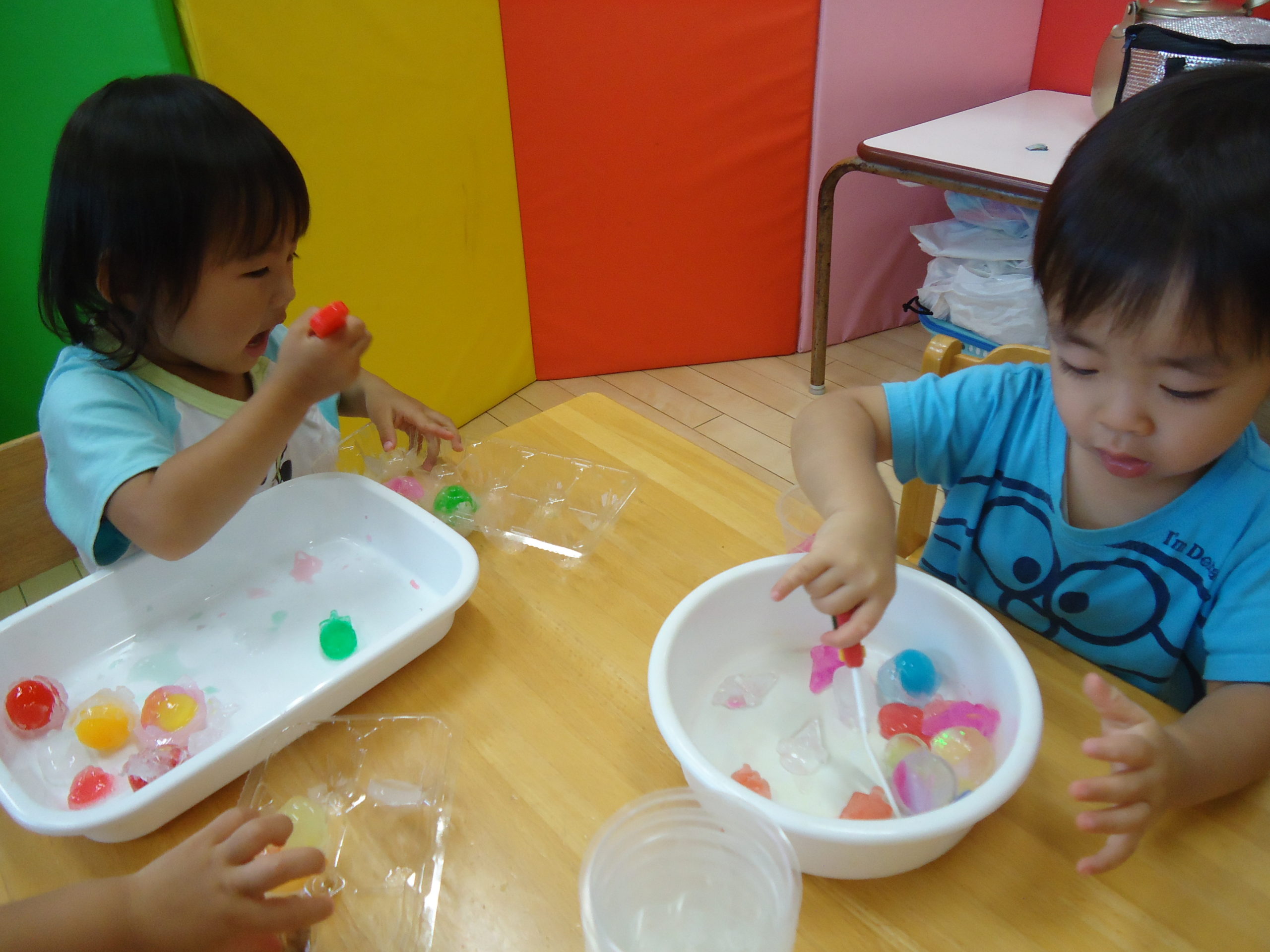 氷1つでも感触や見立て遊び、つるつるして握りにくいものを掴み