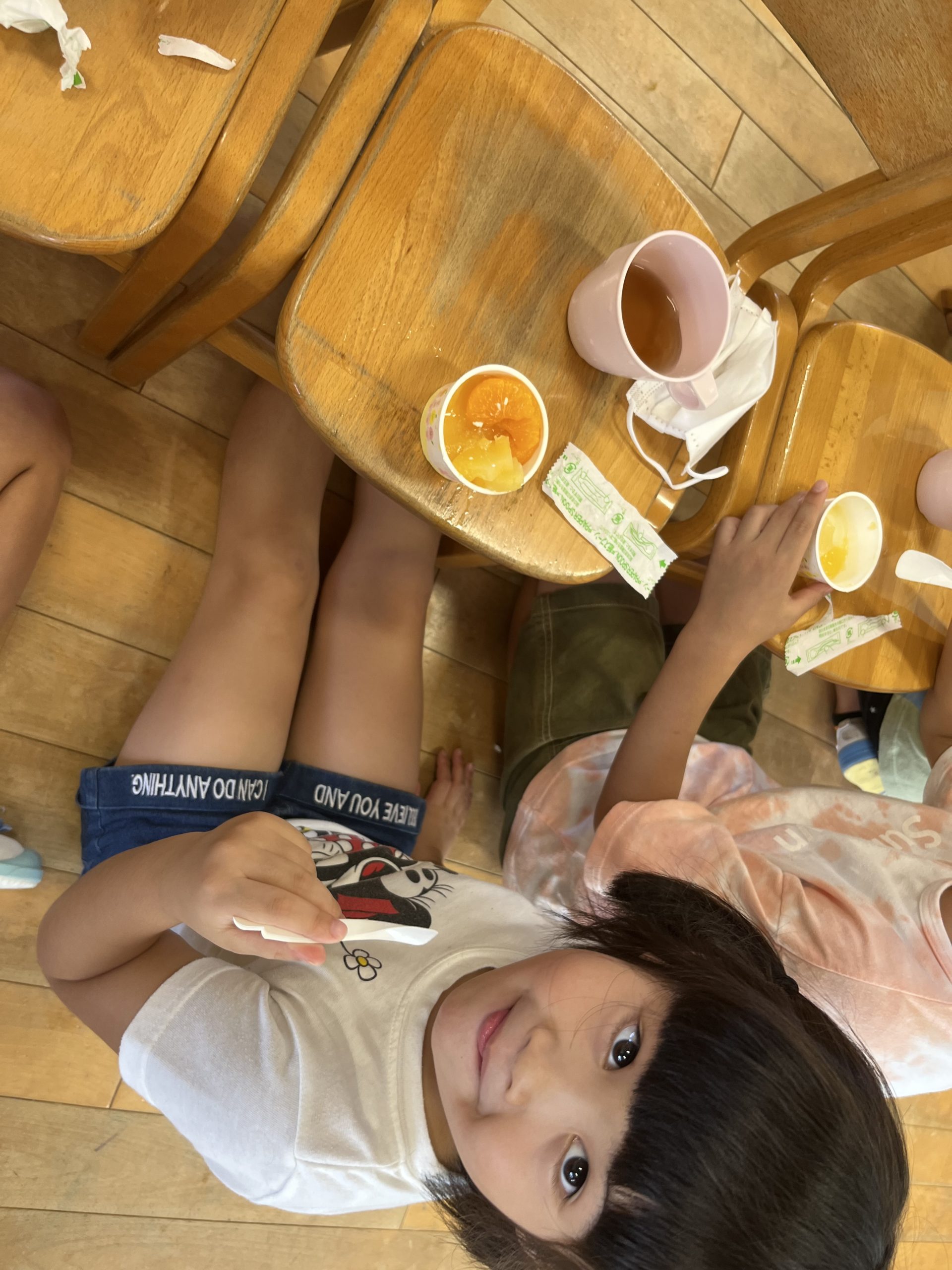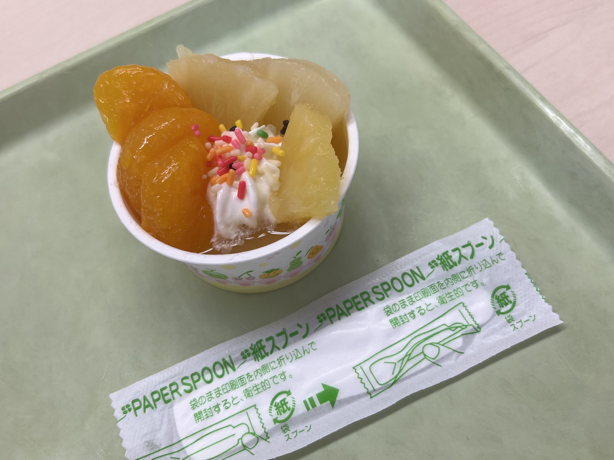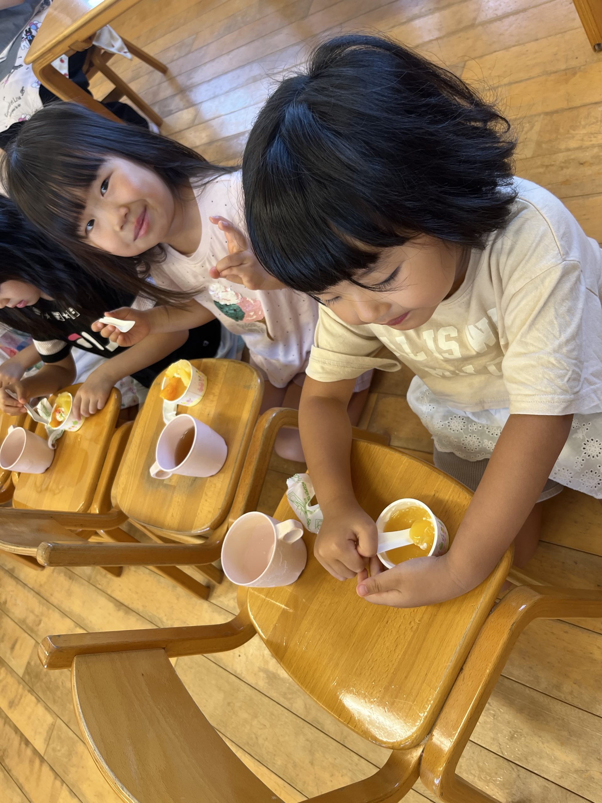 みんな「みかんゼリーだ!」「おいしい!」「みかんが3つものってるよ!」