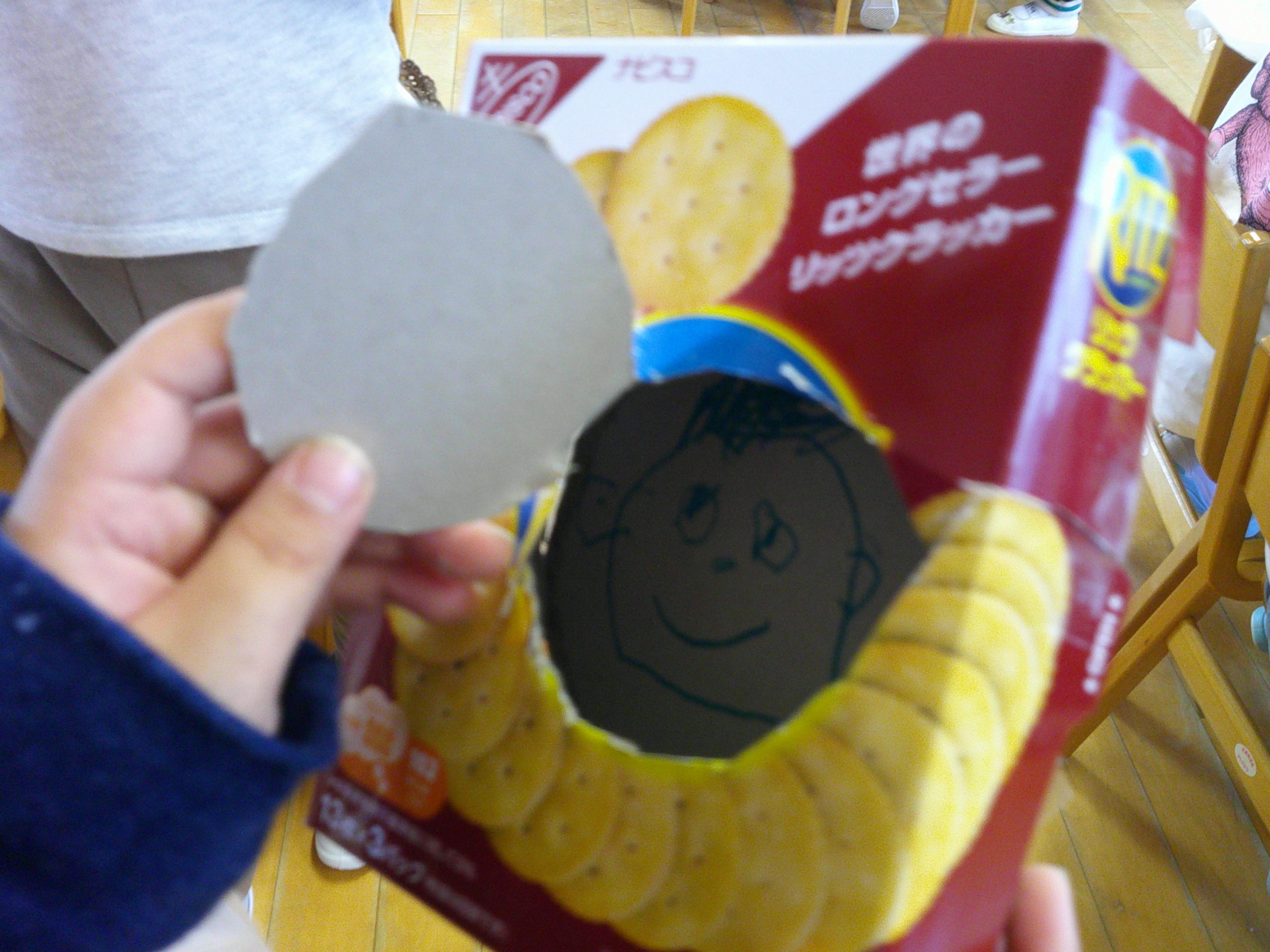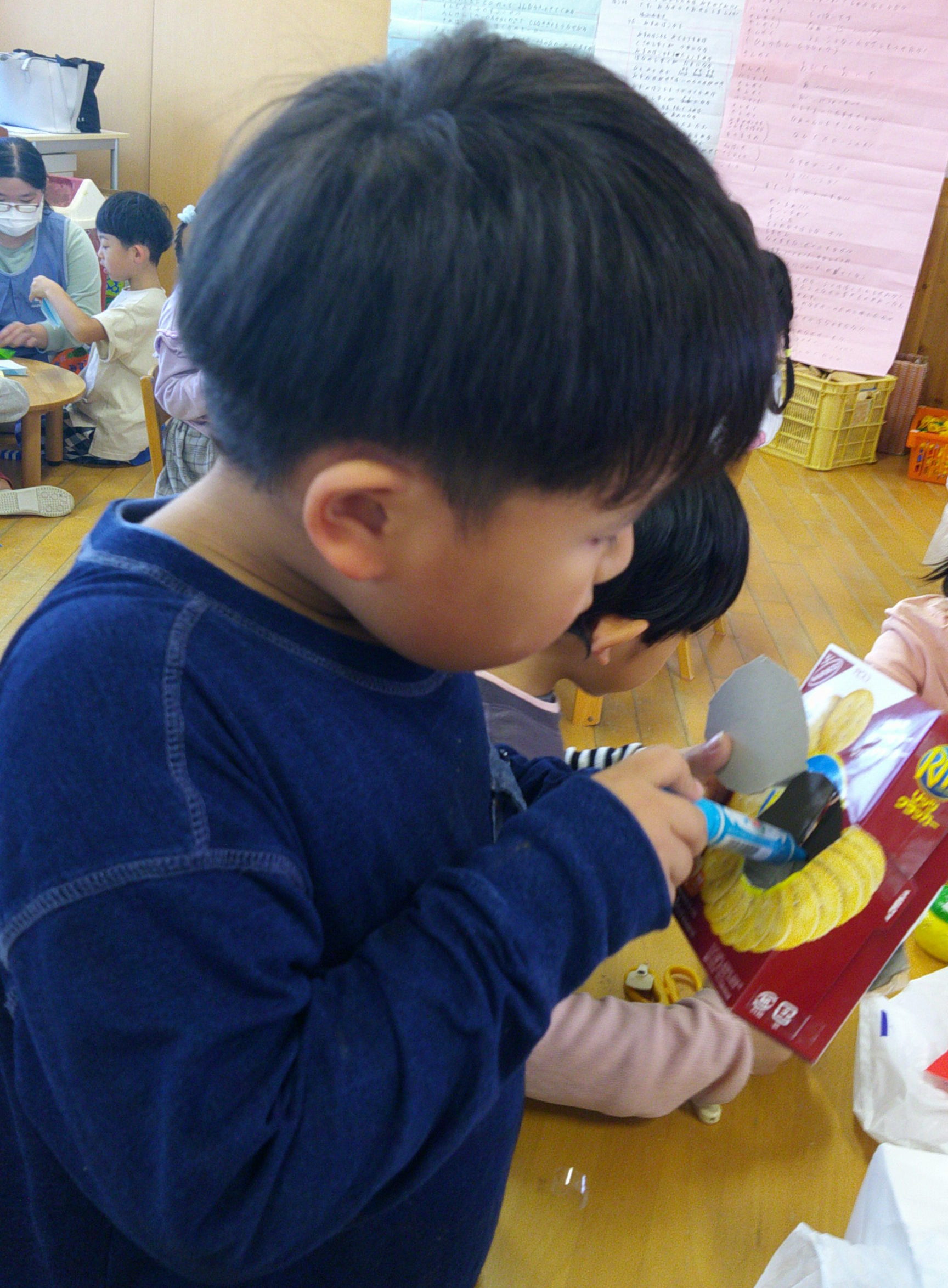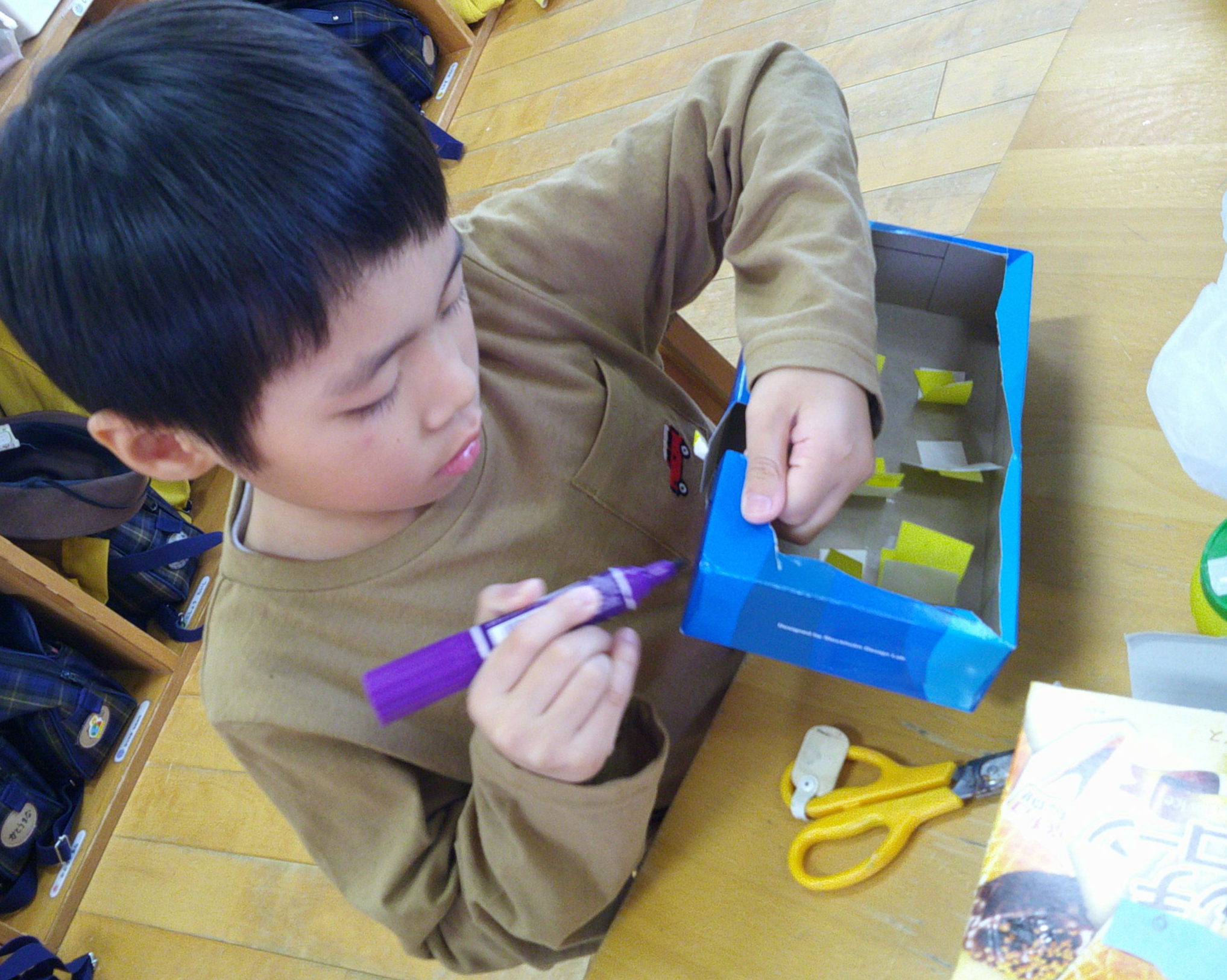 黙々と箱の中を切り抜き、描く男の子。しばらくすると、「先生、見てみ~😄」と!箱の中には。。