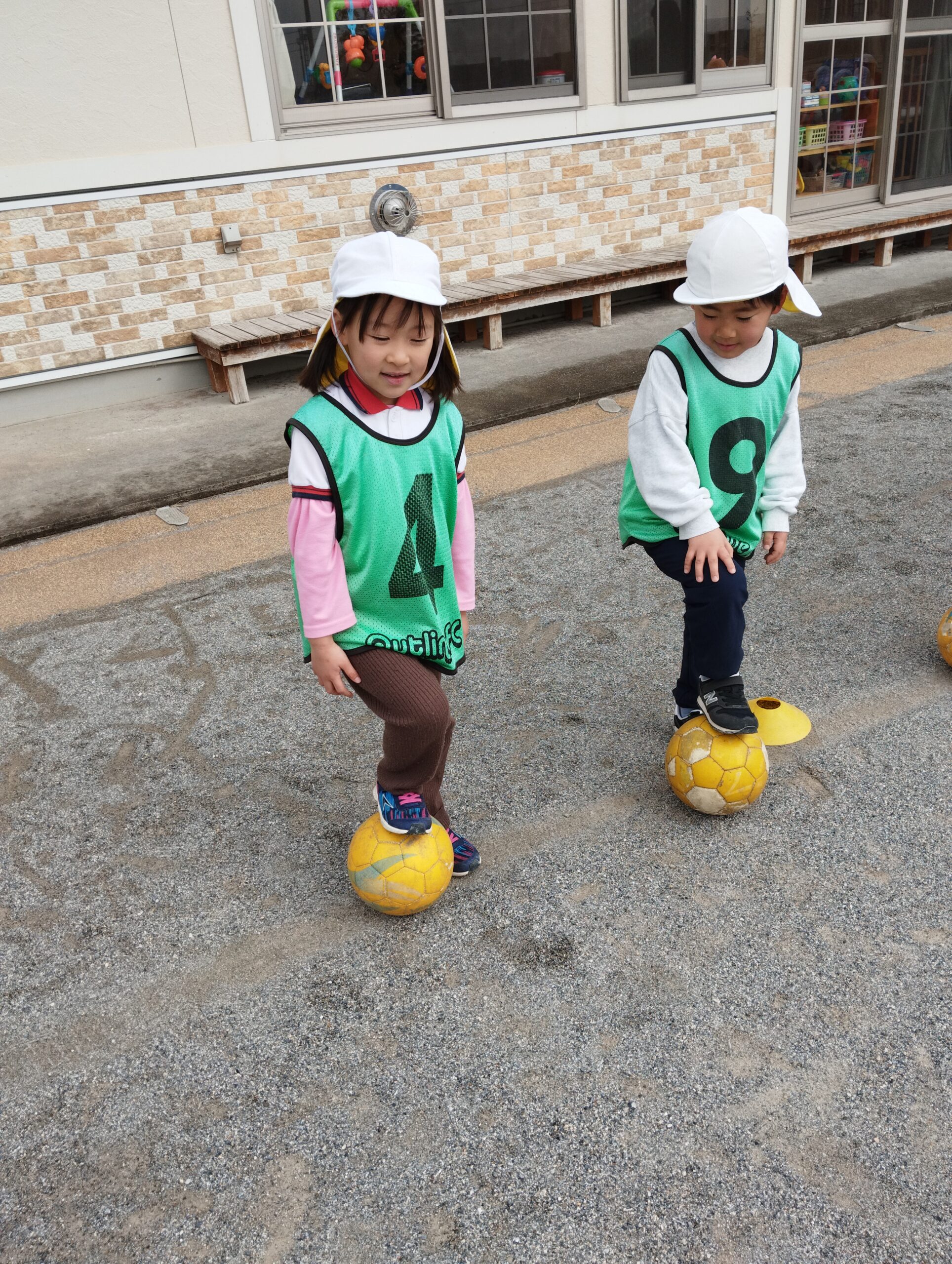 これは、難しい!両足の間にボールを挟み、ジャンプ!苦戦しながらも、どんな態勢で挑めばいいのか考えながら、何度もチャレンジする子どもたちでした😊