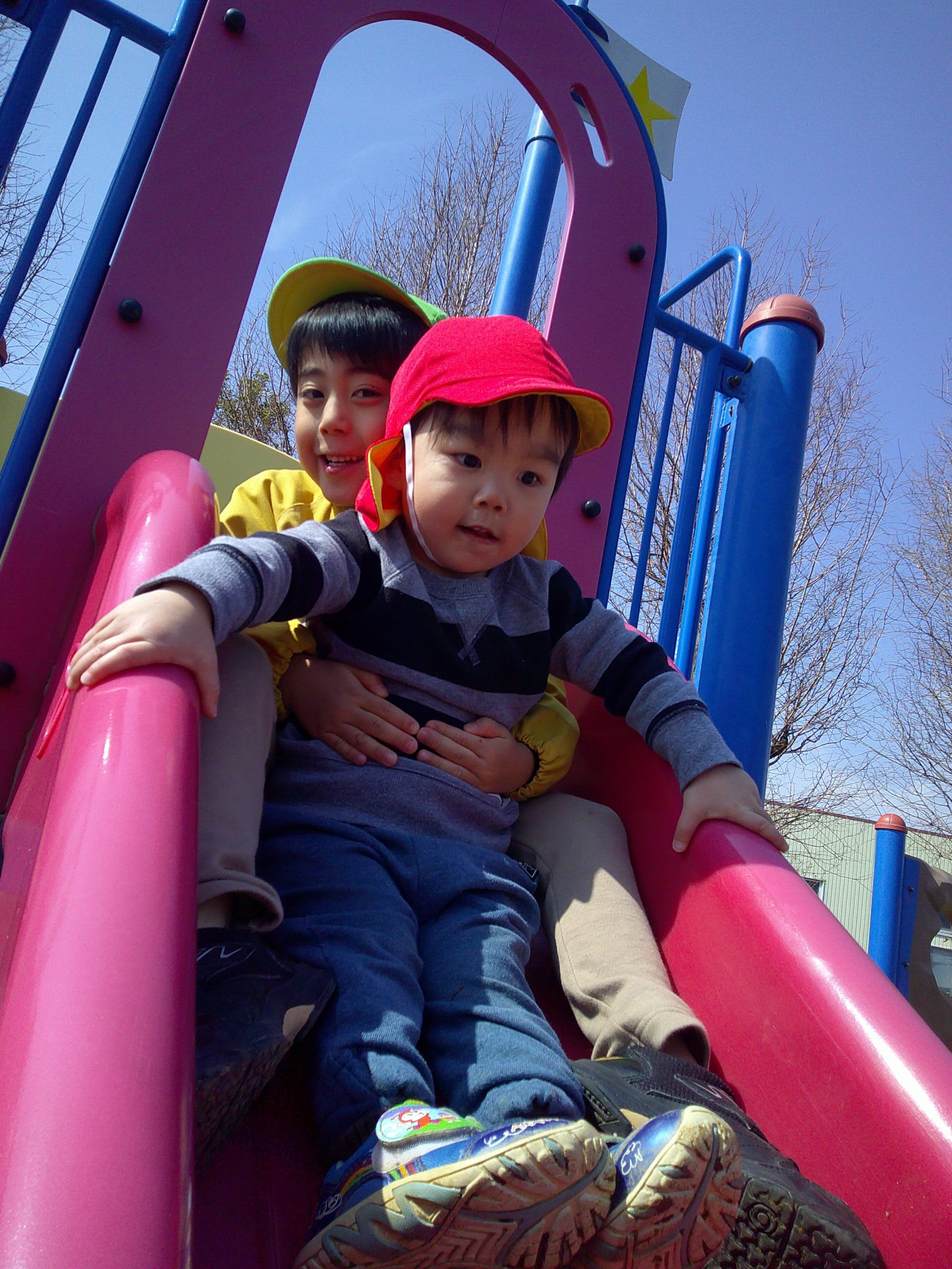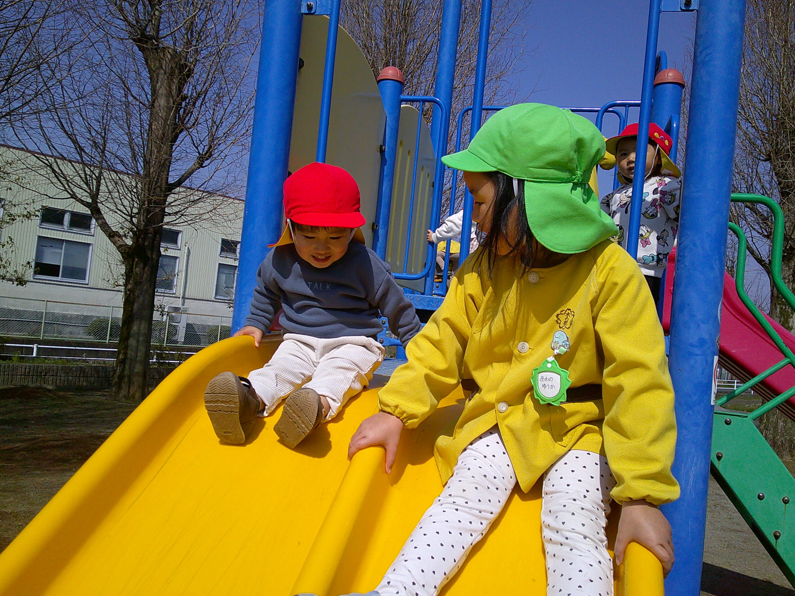 お姉さんと一緒に大好きな滑り台!思わず笑顔になりました😊