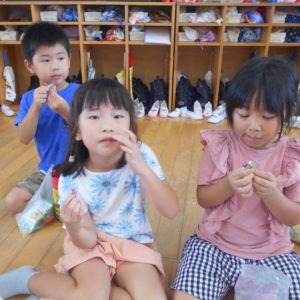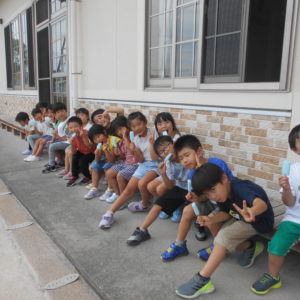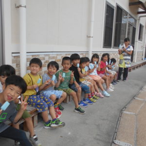 今日だけ特別なソーダ味のアイス!せっかくなので園庭のベンチでみんなで食べました