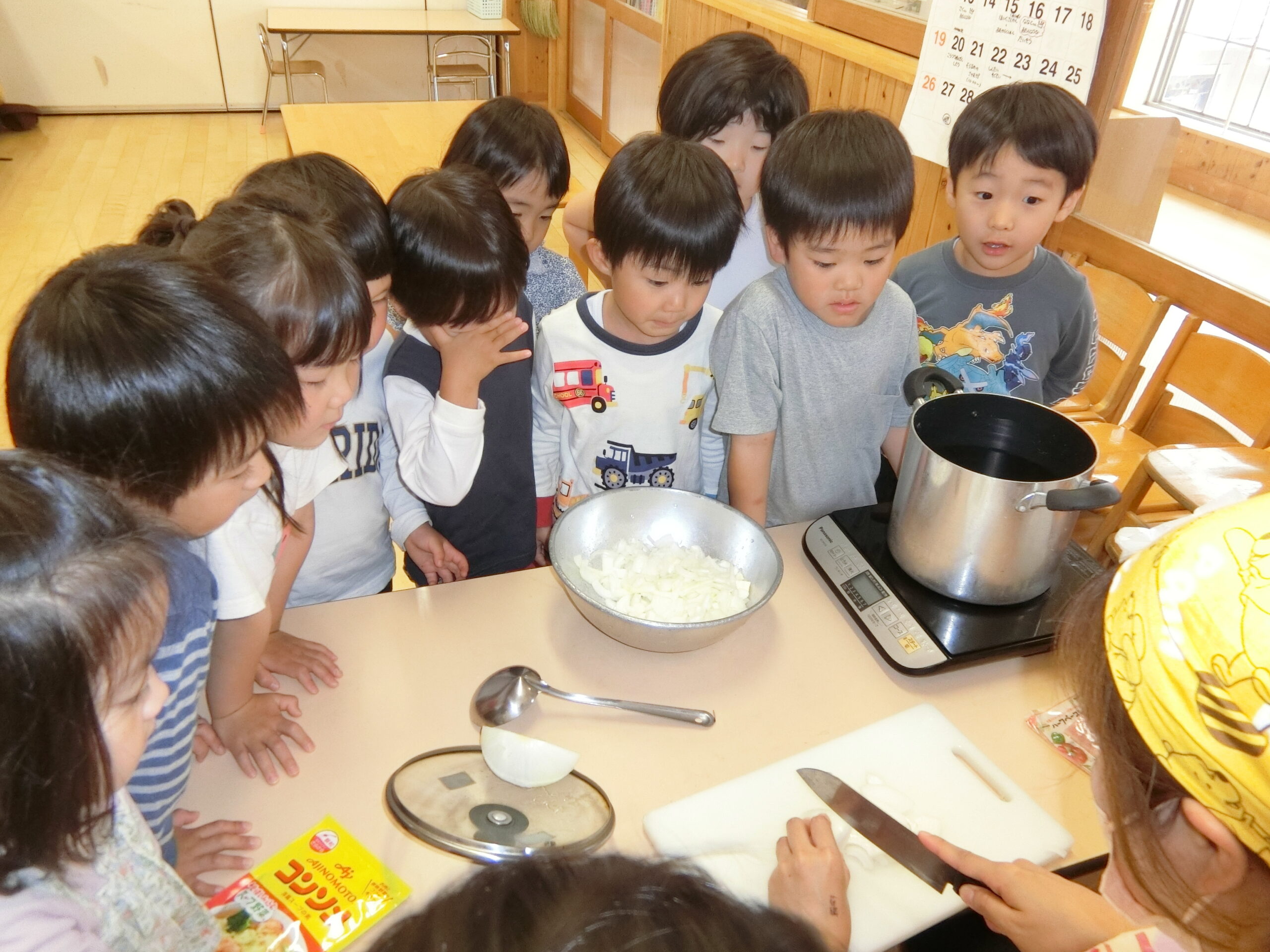 保育士が玉ねぎを切るのをじーっと見守ってくれる子どもたち。見られている私もどきどきしました(笑)