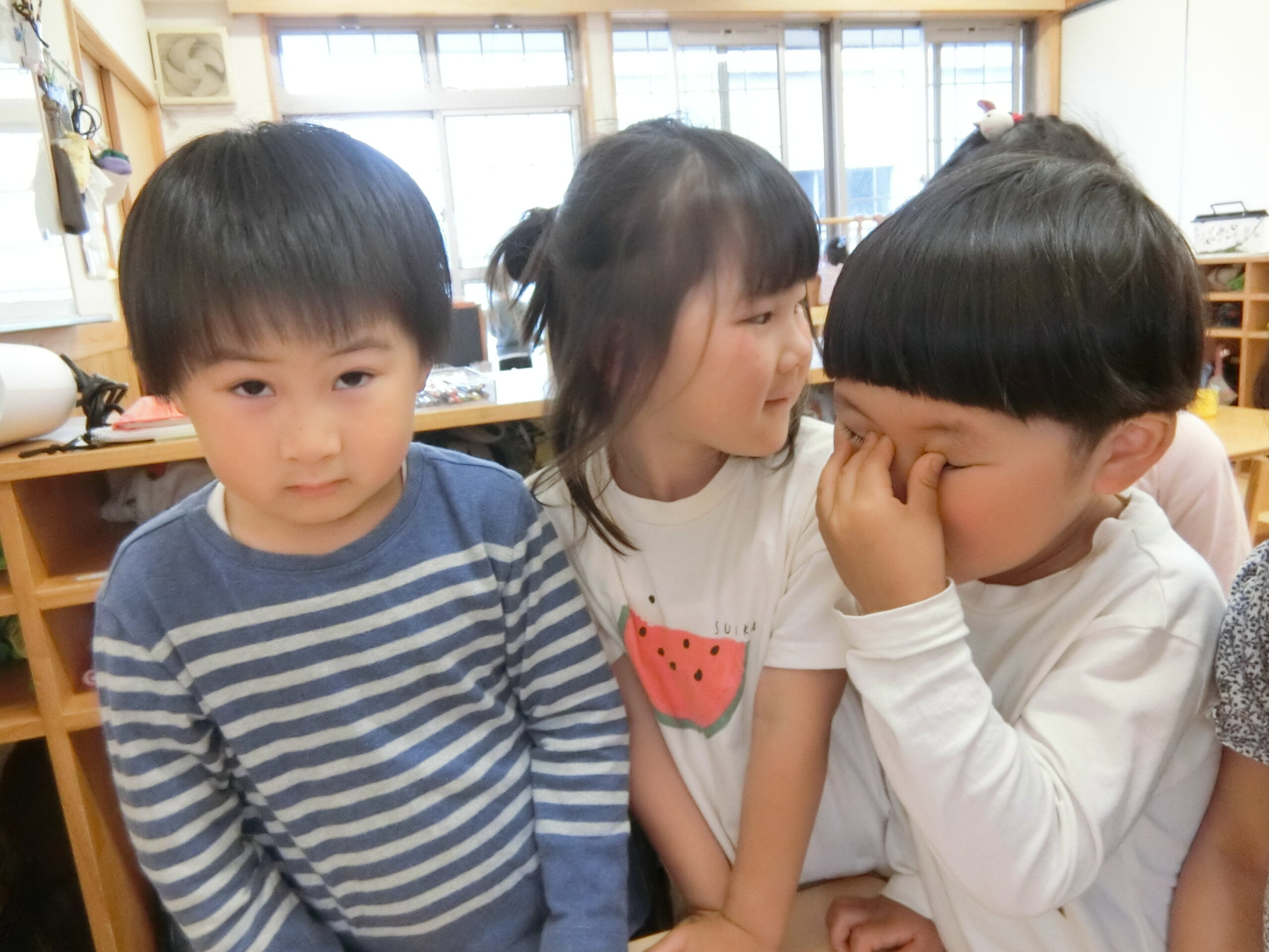 玉ねぎを切っているそばにいると目に染みてしまったのか思わず目を抑える子も・・・。