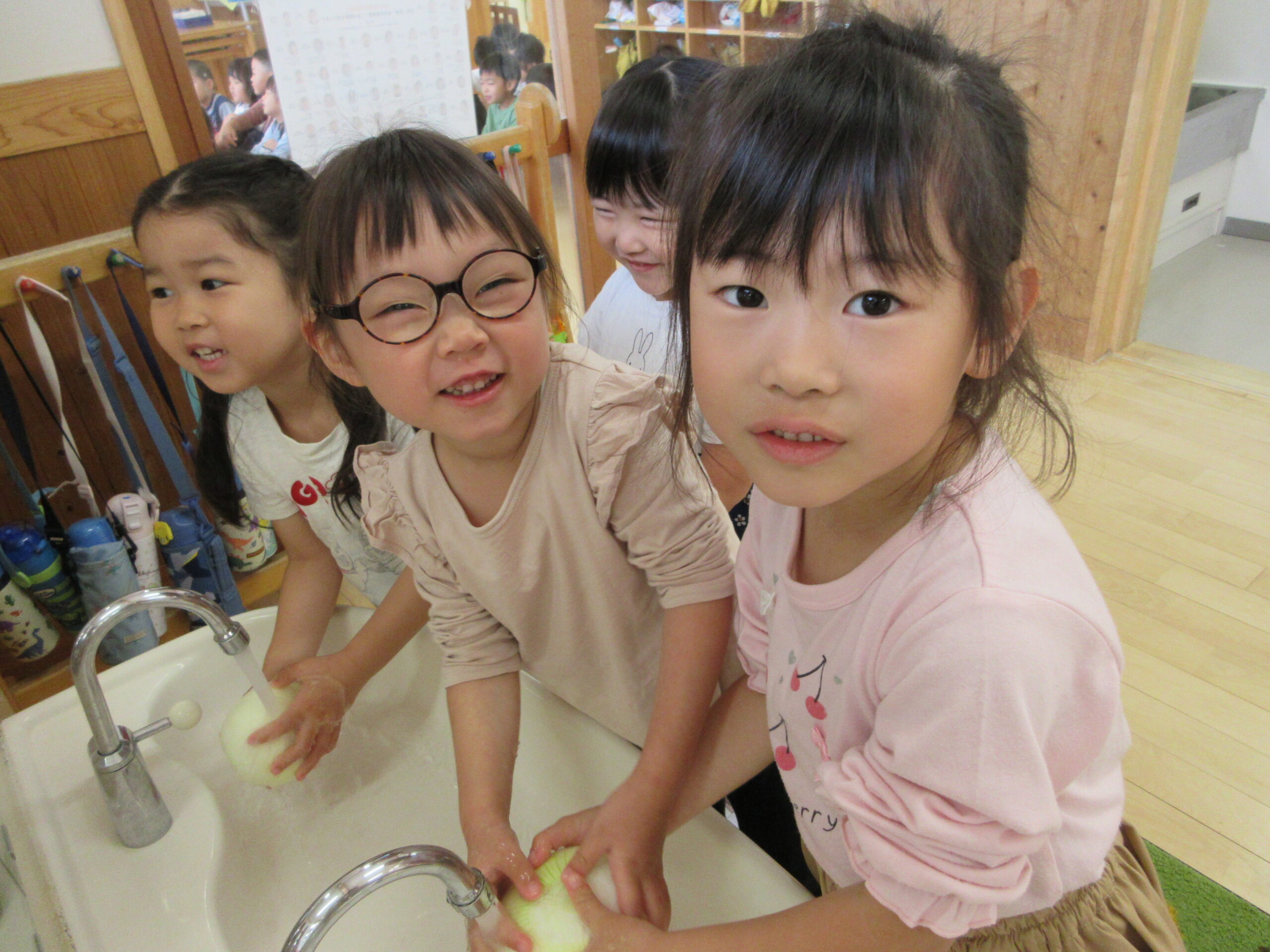 まずは玉ねぎを洗うところから!女の子たちが上手にお手伝いをしてくれましたよ❤