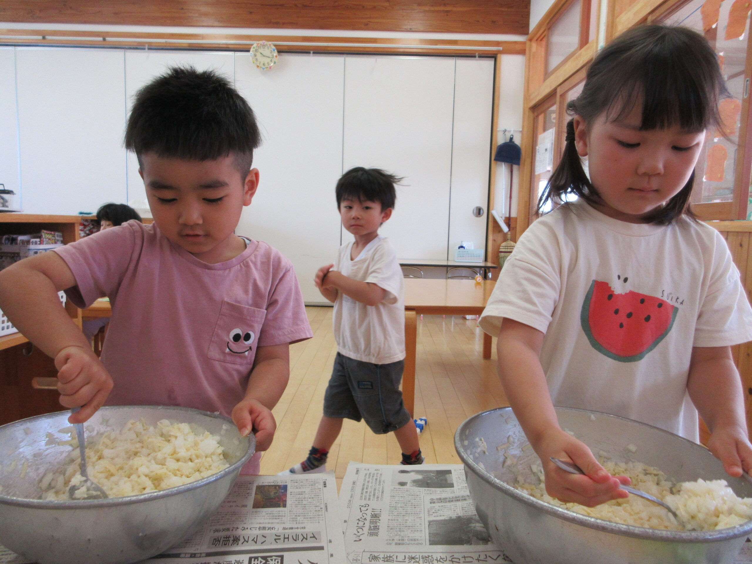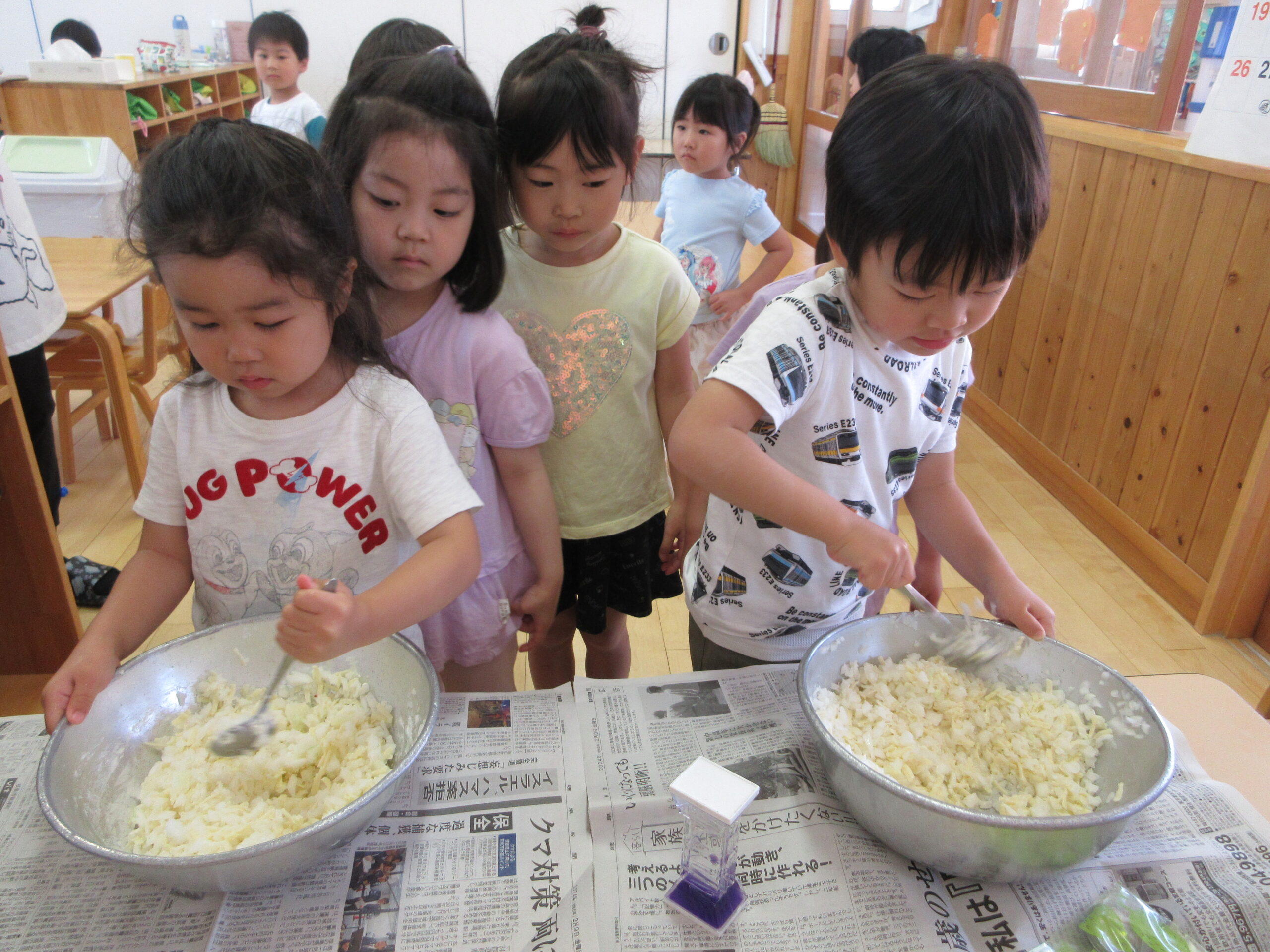 材料をボールの中でまぜまぜ・・とたくさんのお友だちがお手伝い✨
