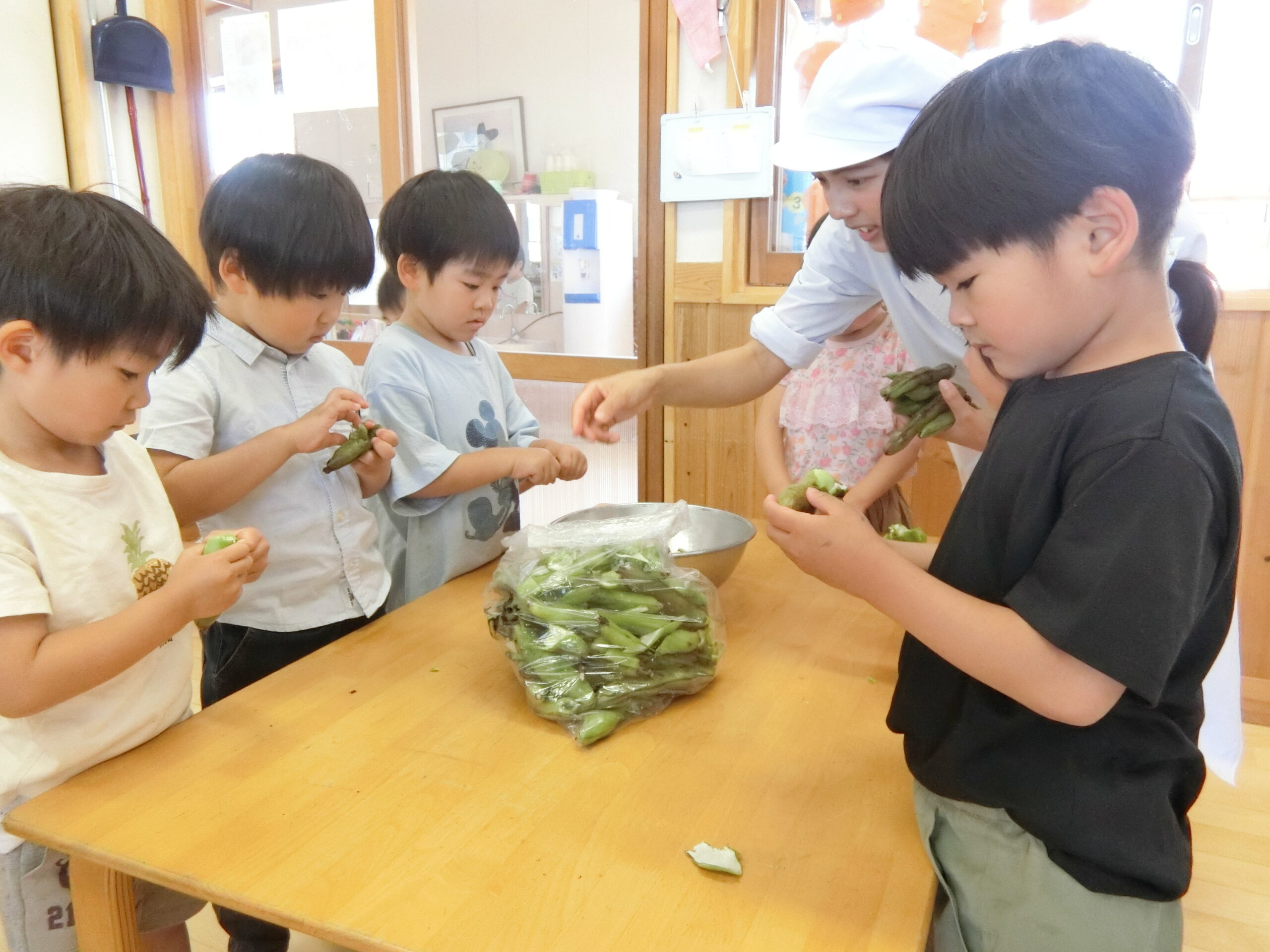 給食室の先生からそらまめについてお話を聞いた後さやむきに挑戦!