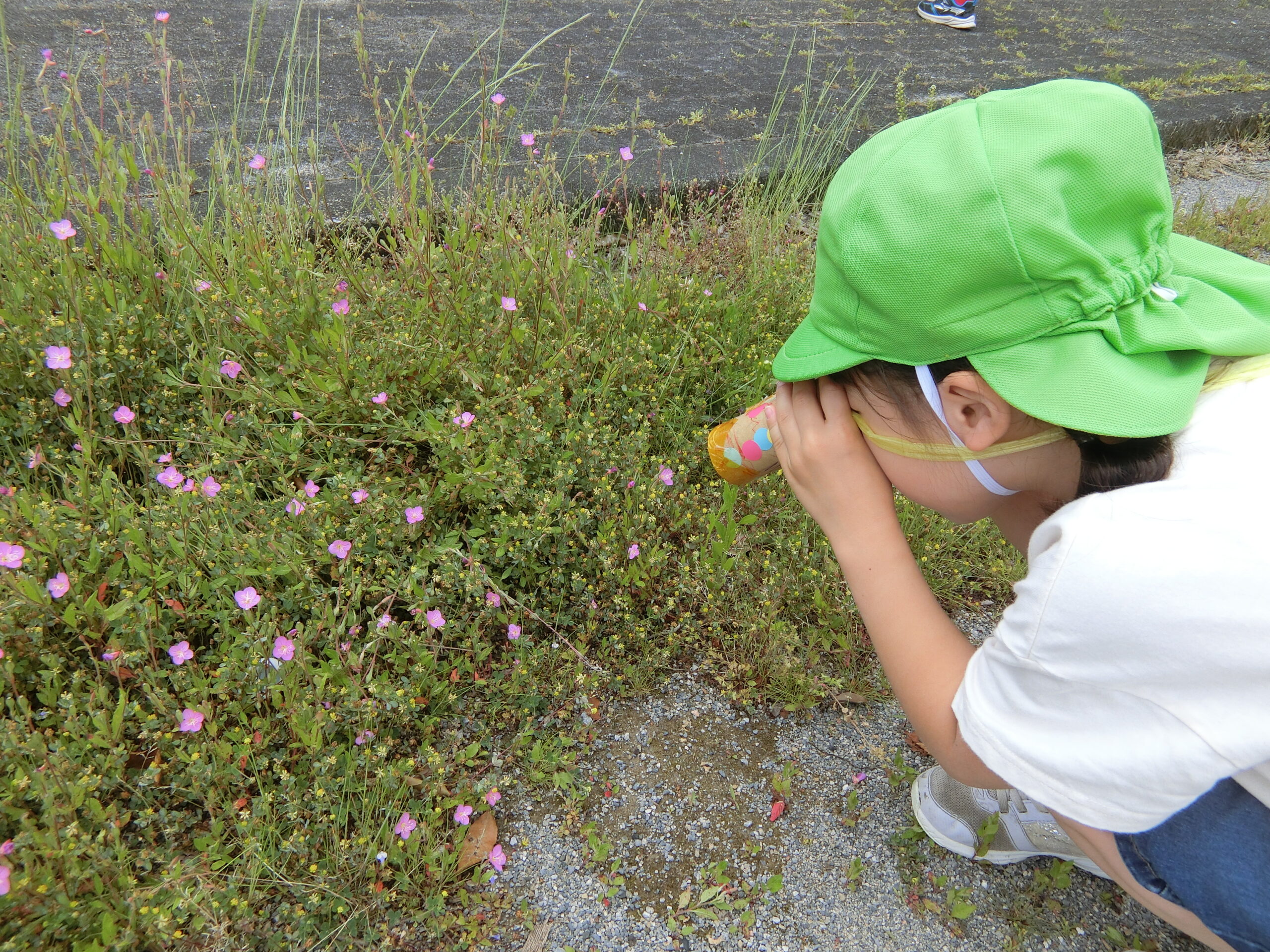 お散歩には作った双眼鏡も持っていき、お花や虫を観察してみたり・・・