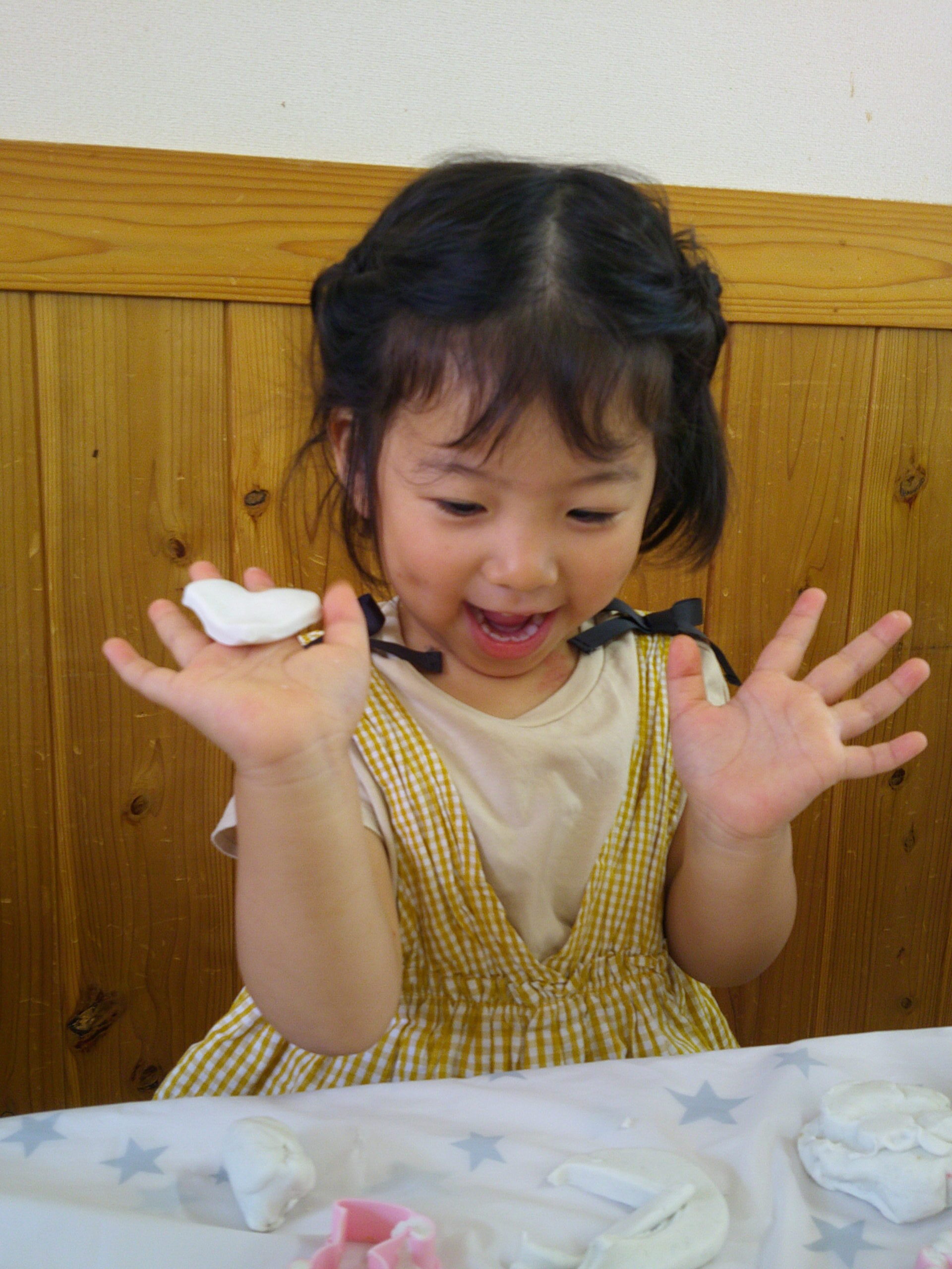 ハートを手に持ち、型抜きできた嬉しさ爆発の表情がかわいいです😊