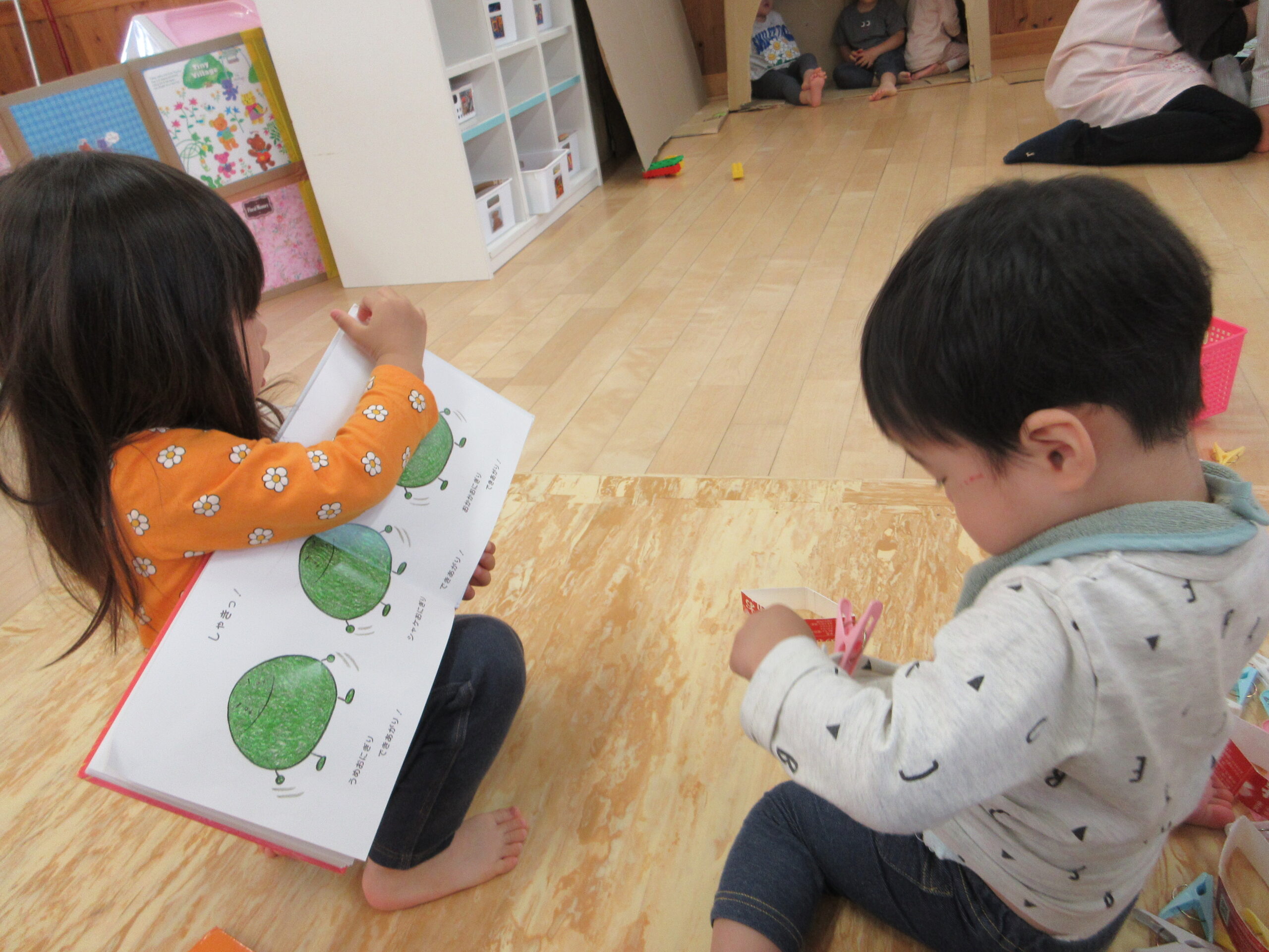 お友だちに絵本を読んであげようと、絵本を広げる子の姿が!