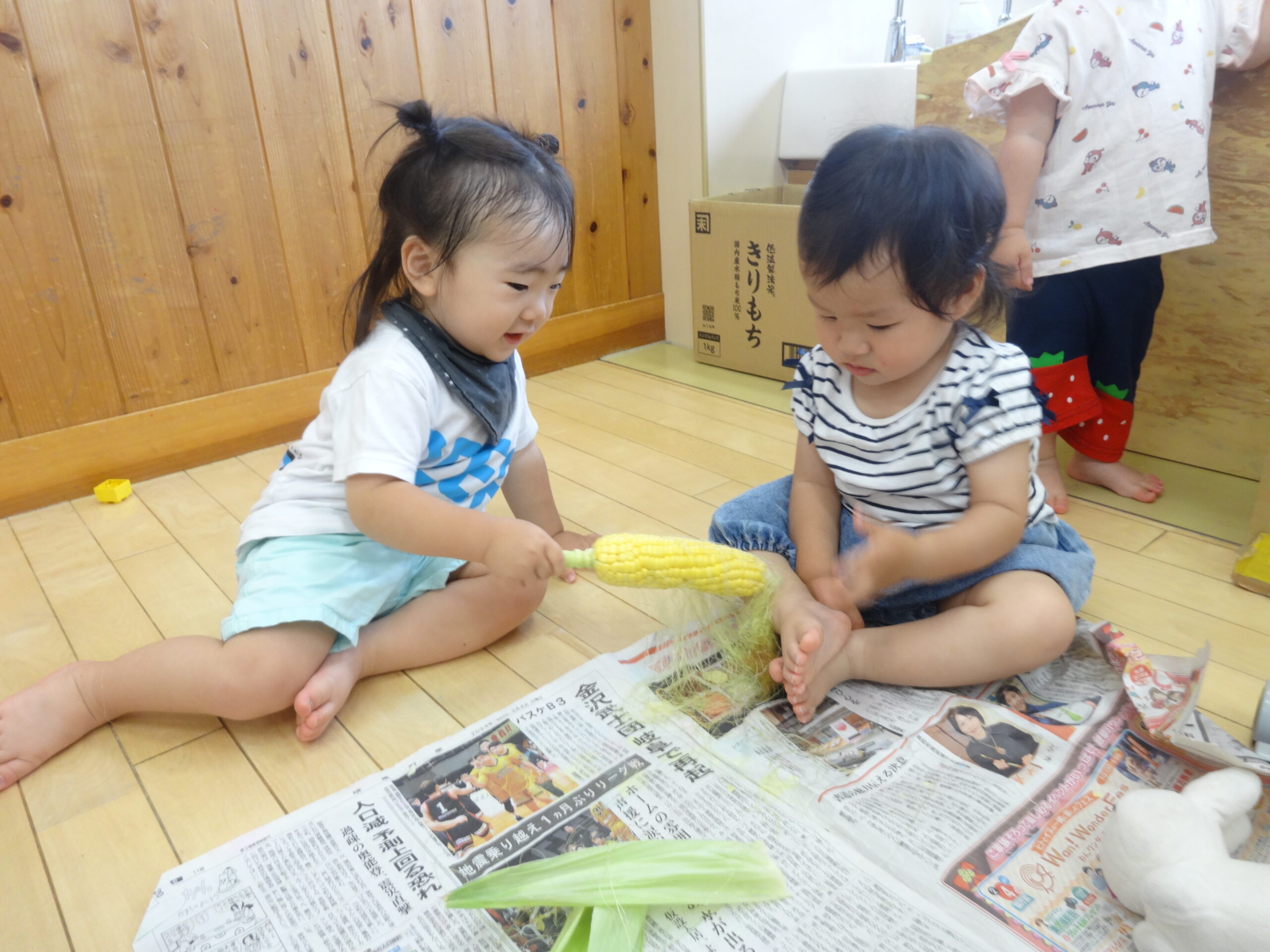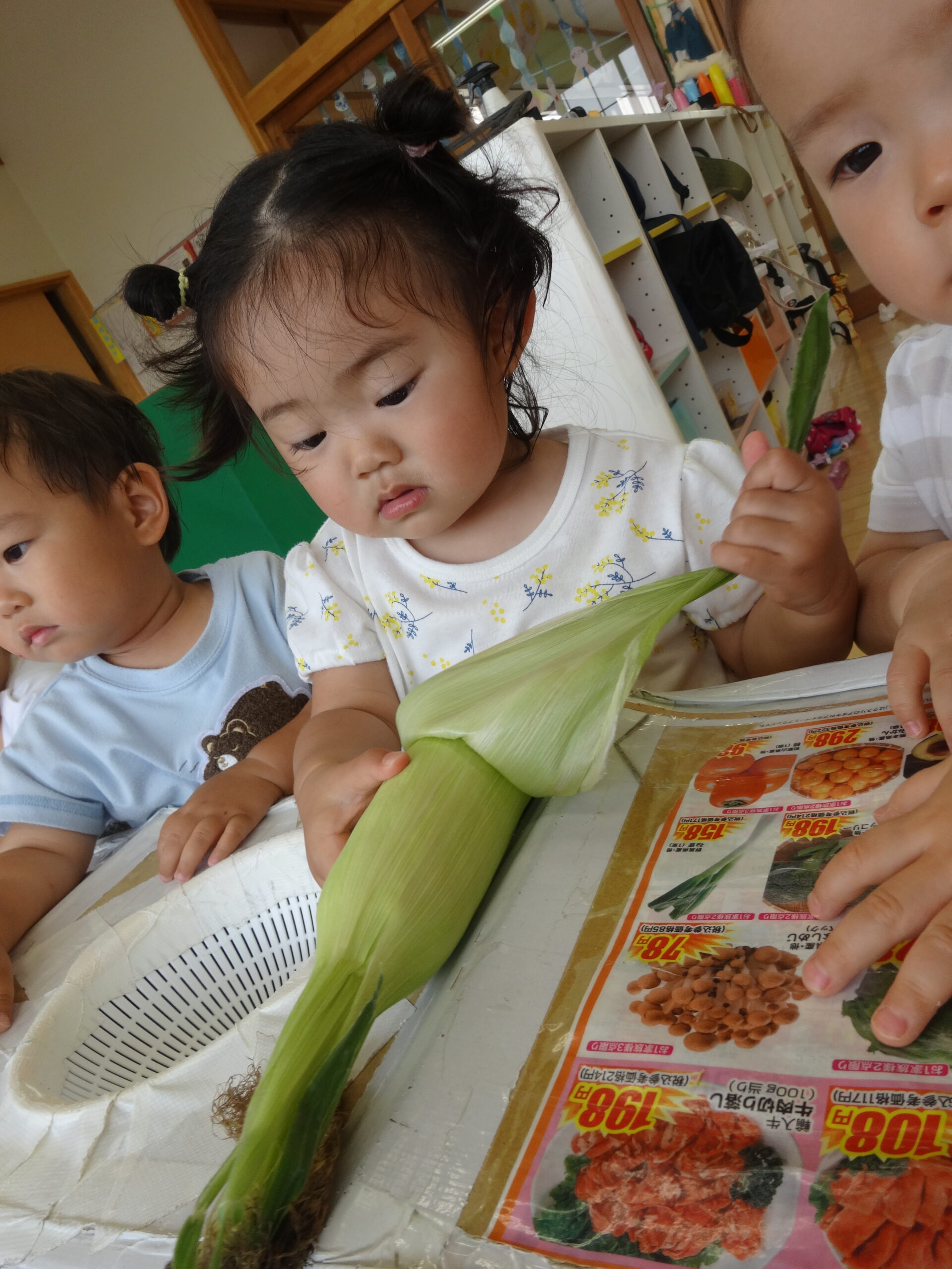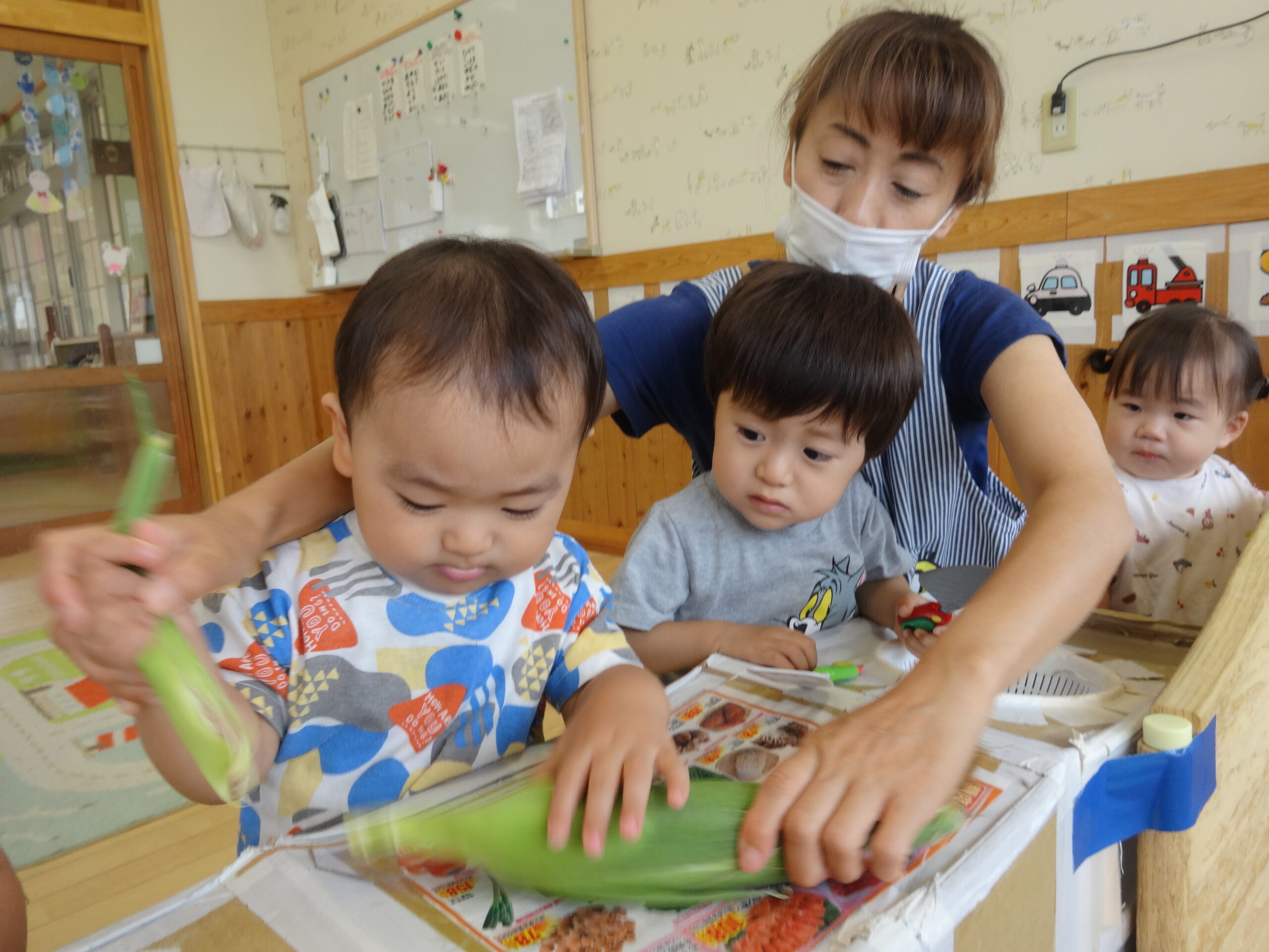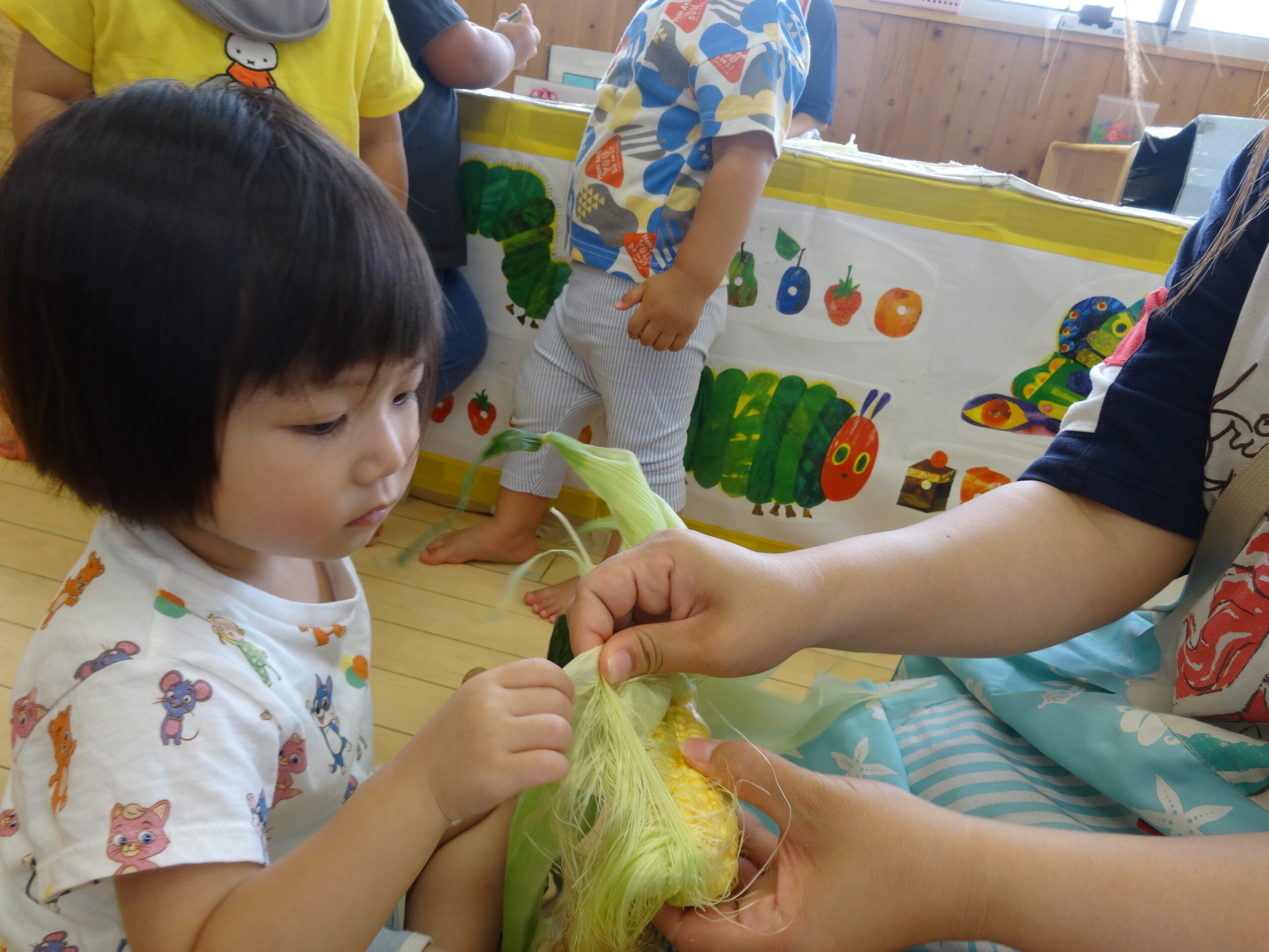 「もじゃもじゃのひげがあるね」「あっ!とうもろこしがみえてきたよ」と保育士と一緒に皮むきをしながら、言葉をかけると、“うんうん”と大きくうなずいたり、発見や思いを表情や片言、指差しをして教えてくれました。