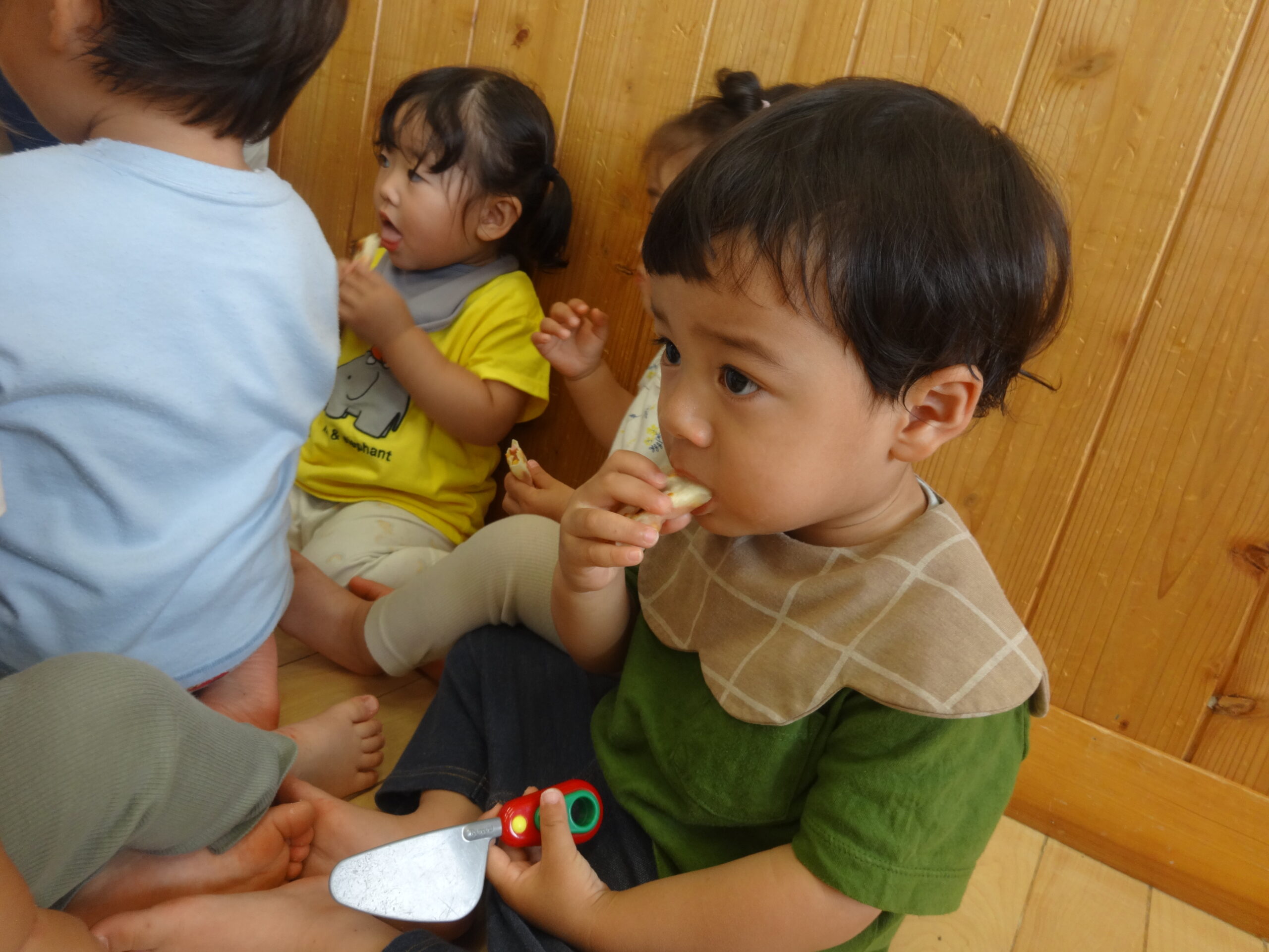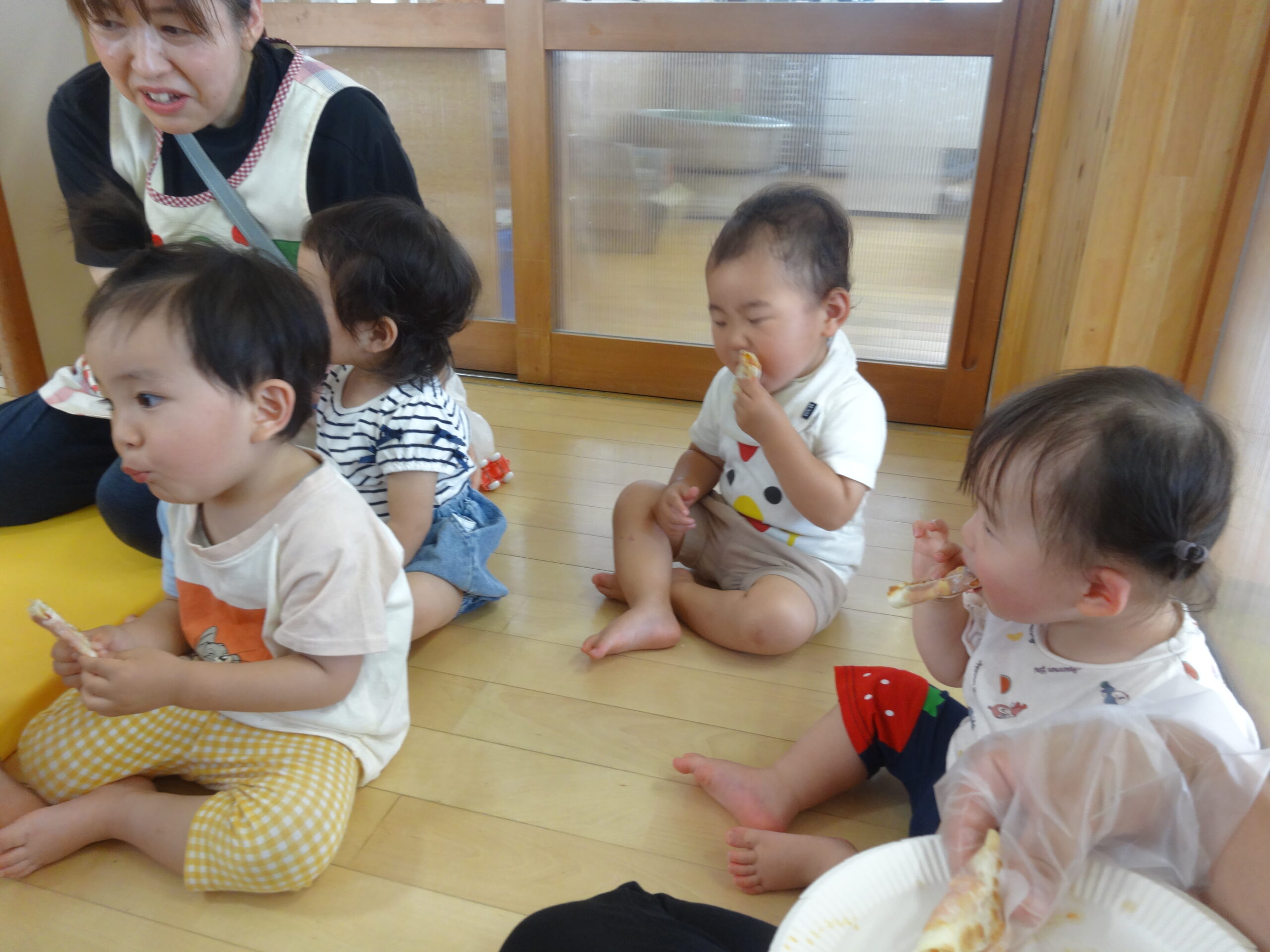できたピザを春巻きにして見せてあげるとみんな意欲的に大きな口を開けてパクパク食べてくれました。とうもろこしが苦手だった子も大好きなウインナーと一緒に完食して、おかわりもしてくれましたよ!