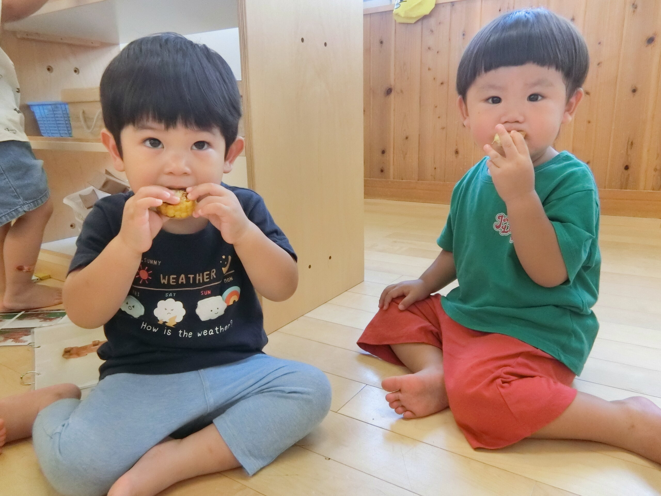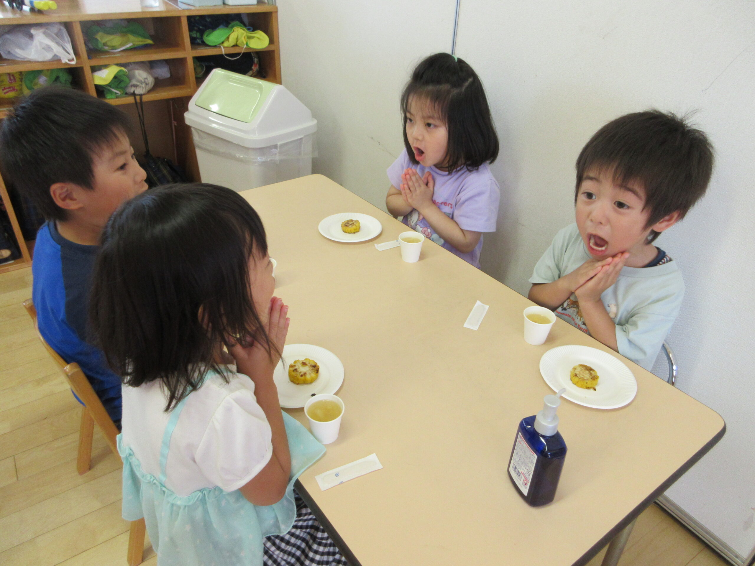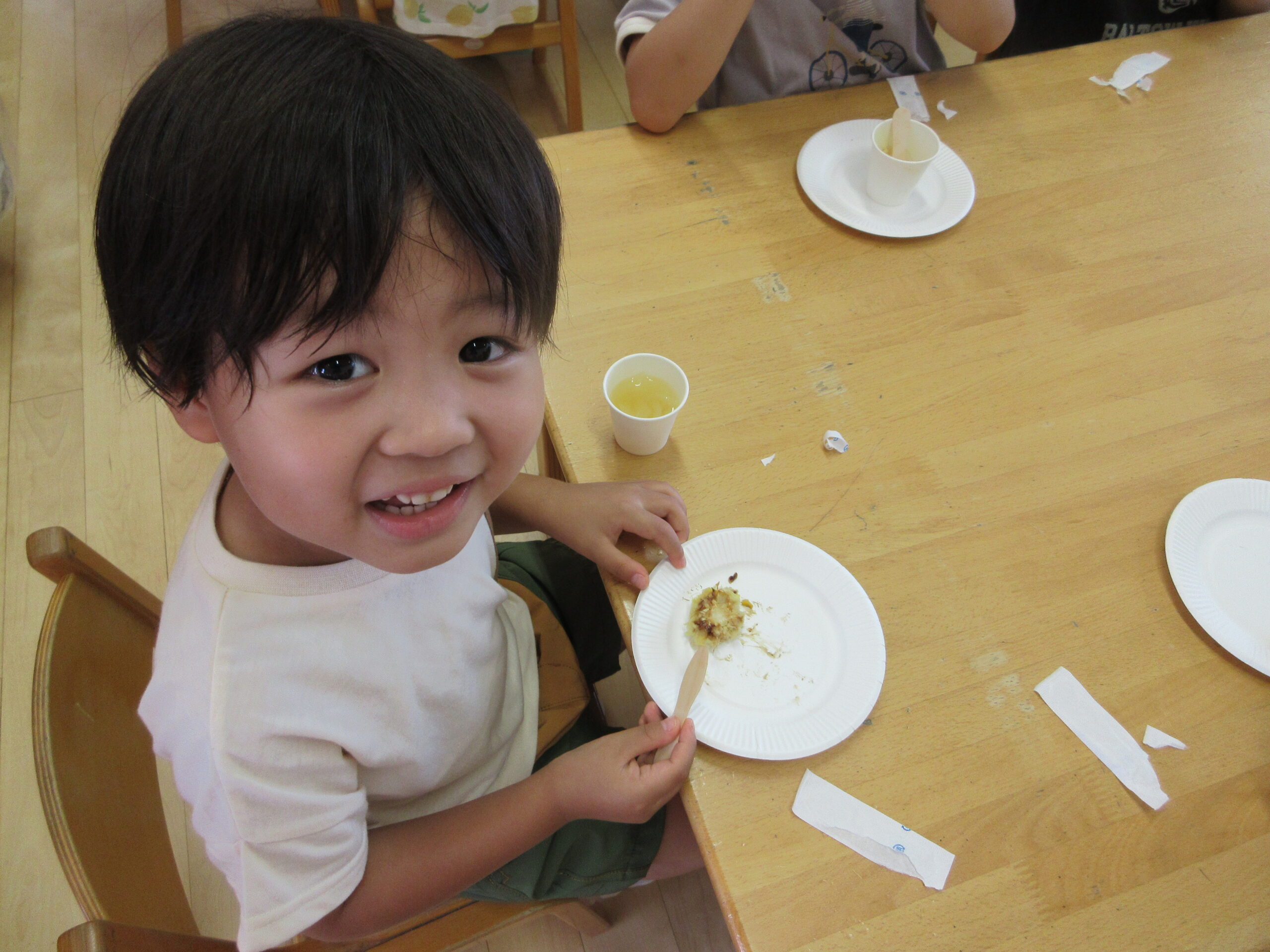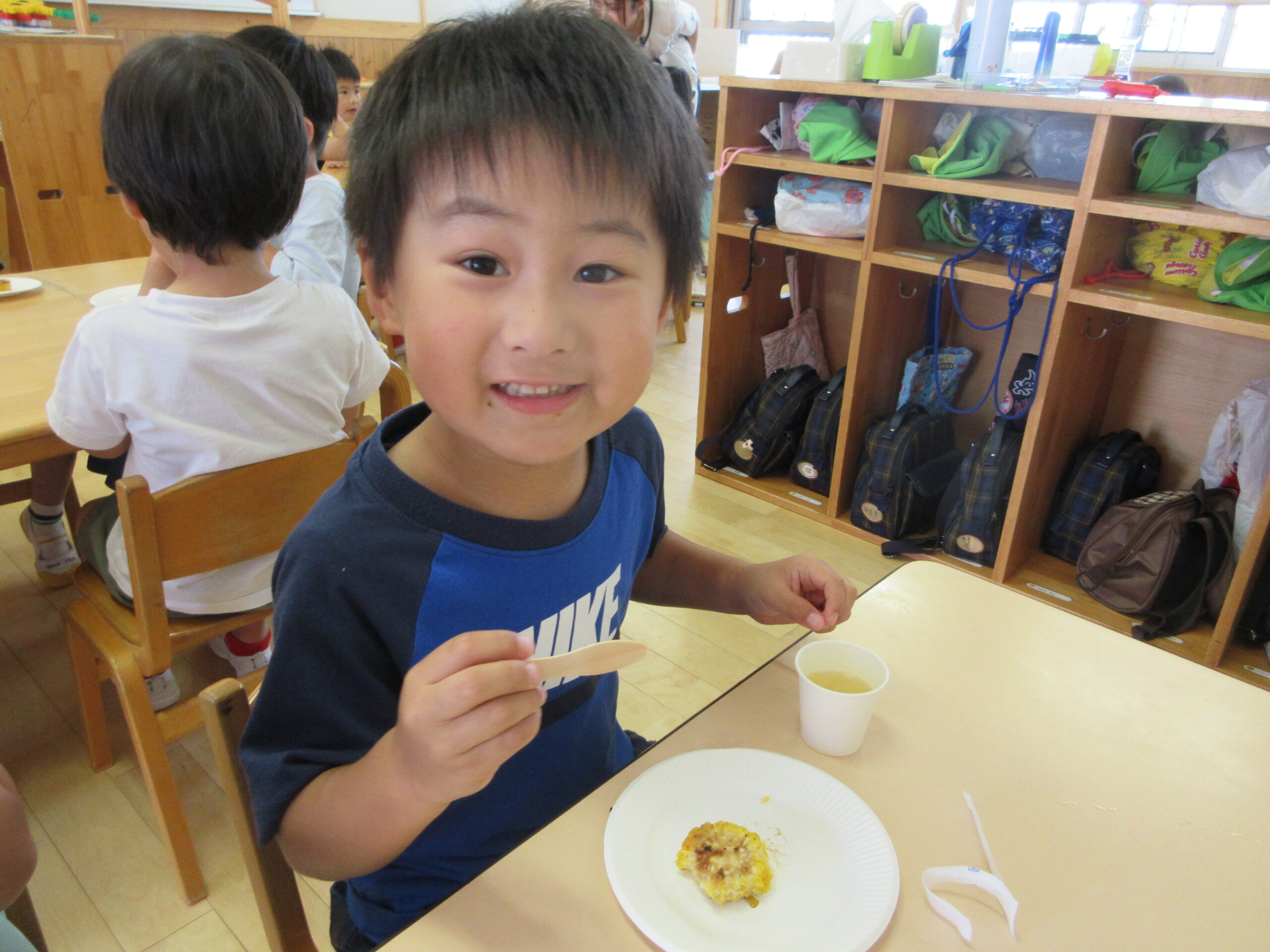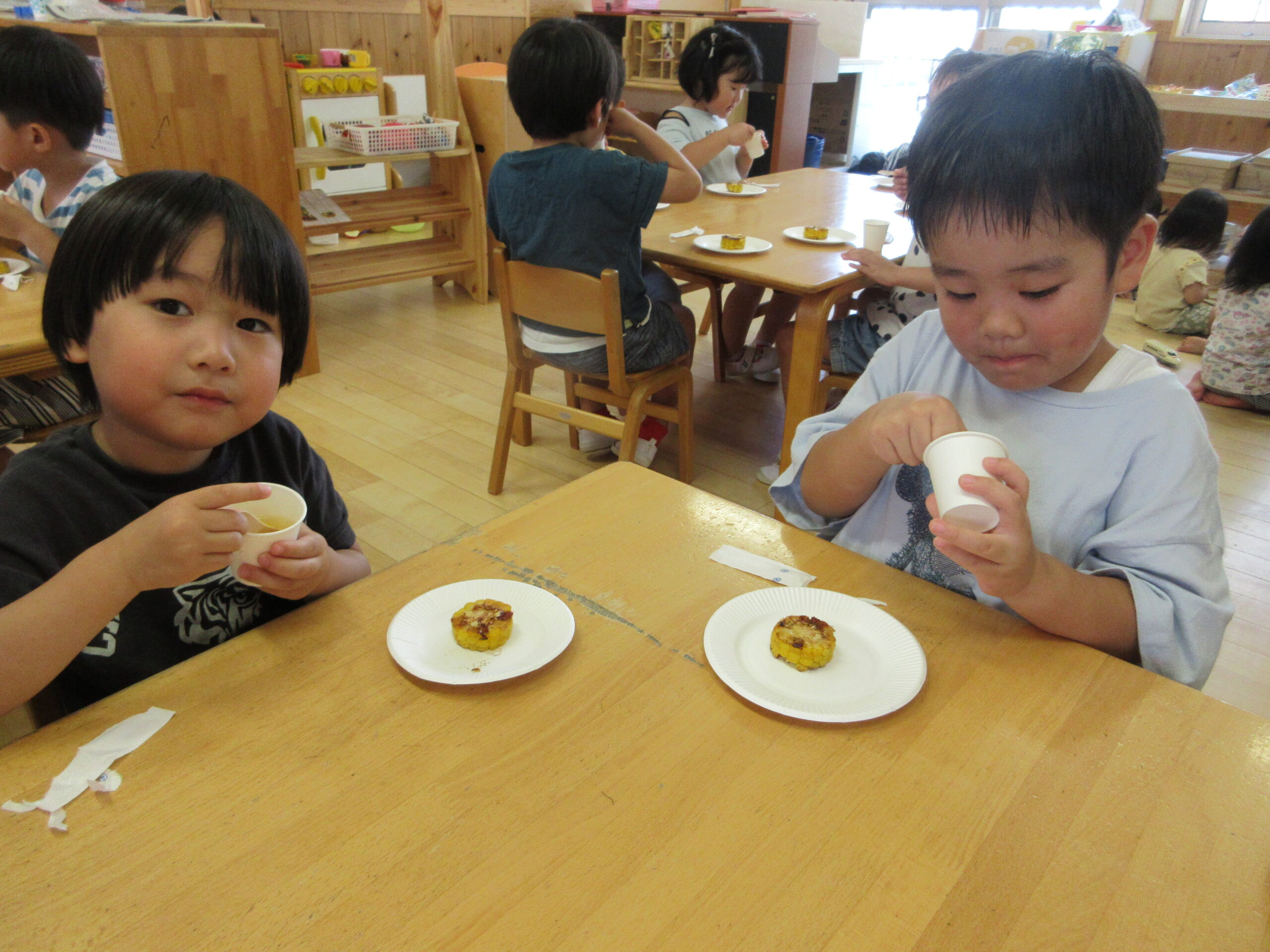 子どもたちが沢山むいてくれたおかげでおやつに美味しいとうもろこしが出てきましたよ!