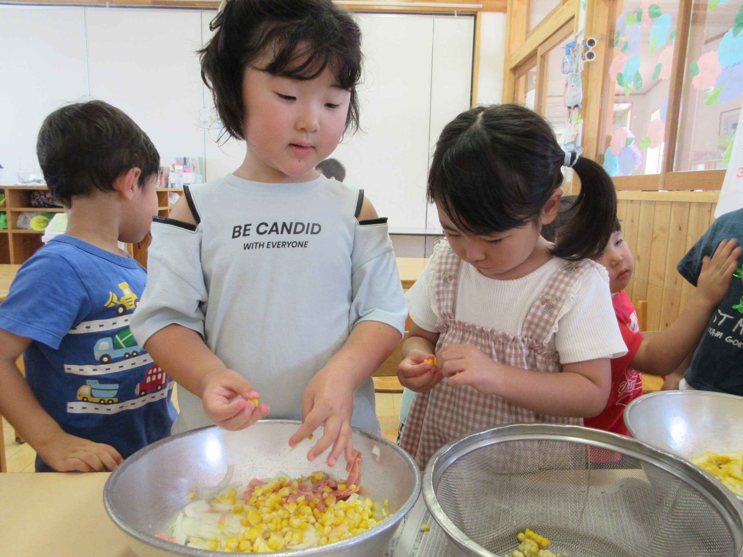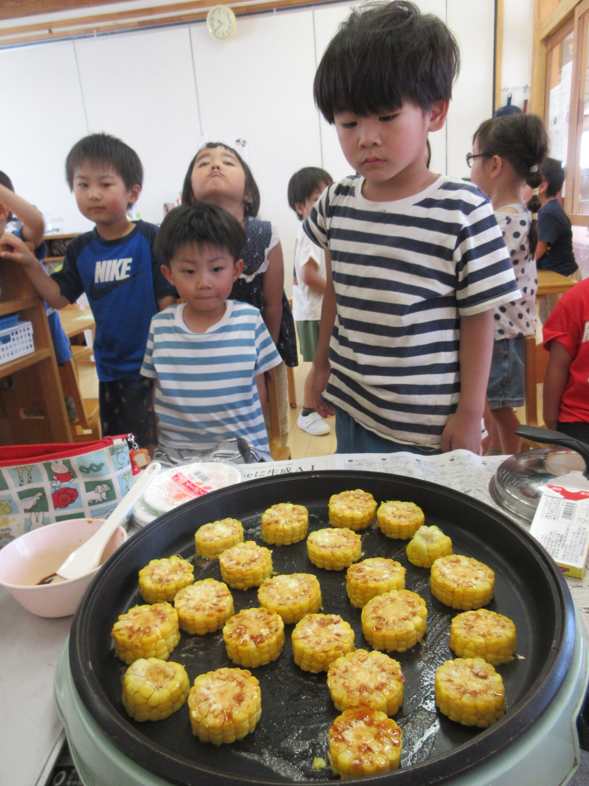 パーティーも5回目となれば子どもたちも慣れたもので、椅子を持って来て保育士がとうもろこしを切るのを見守ってくれています。さすがです👏👏