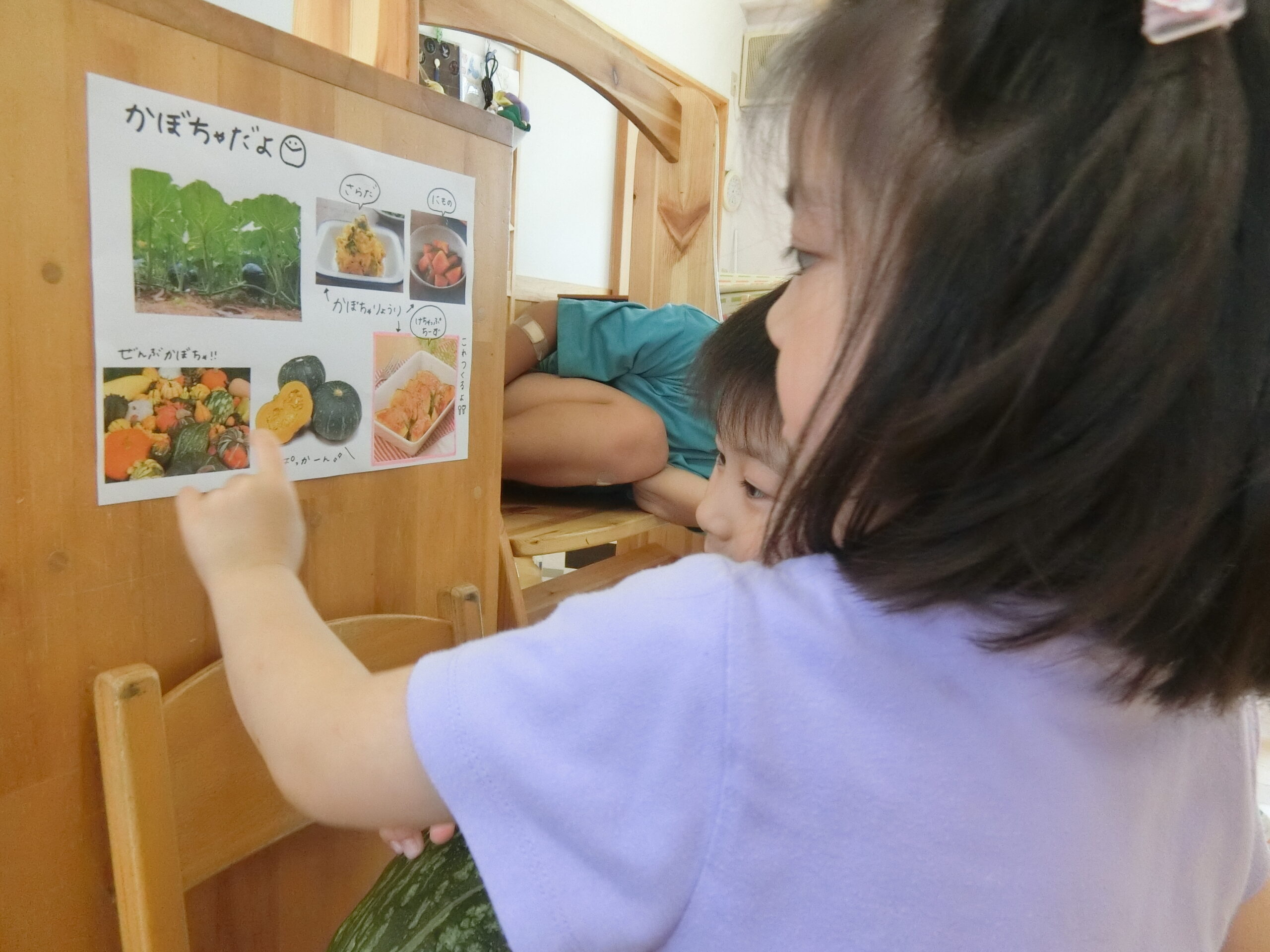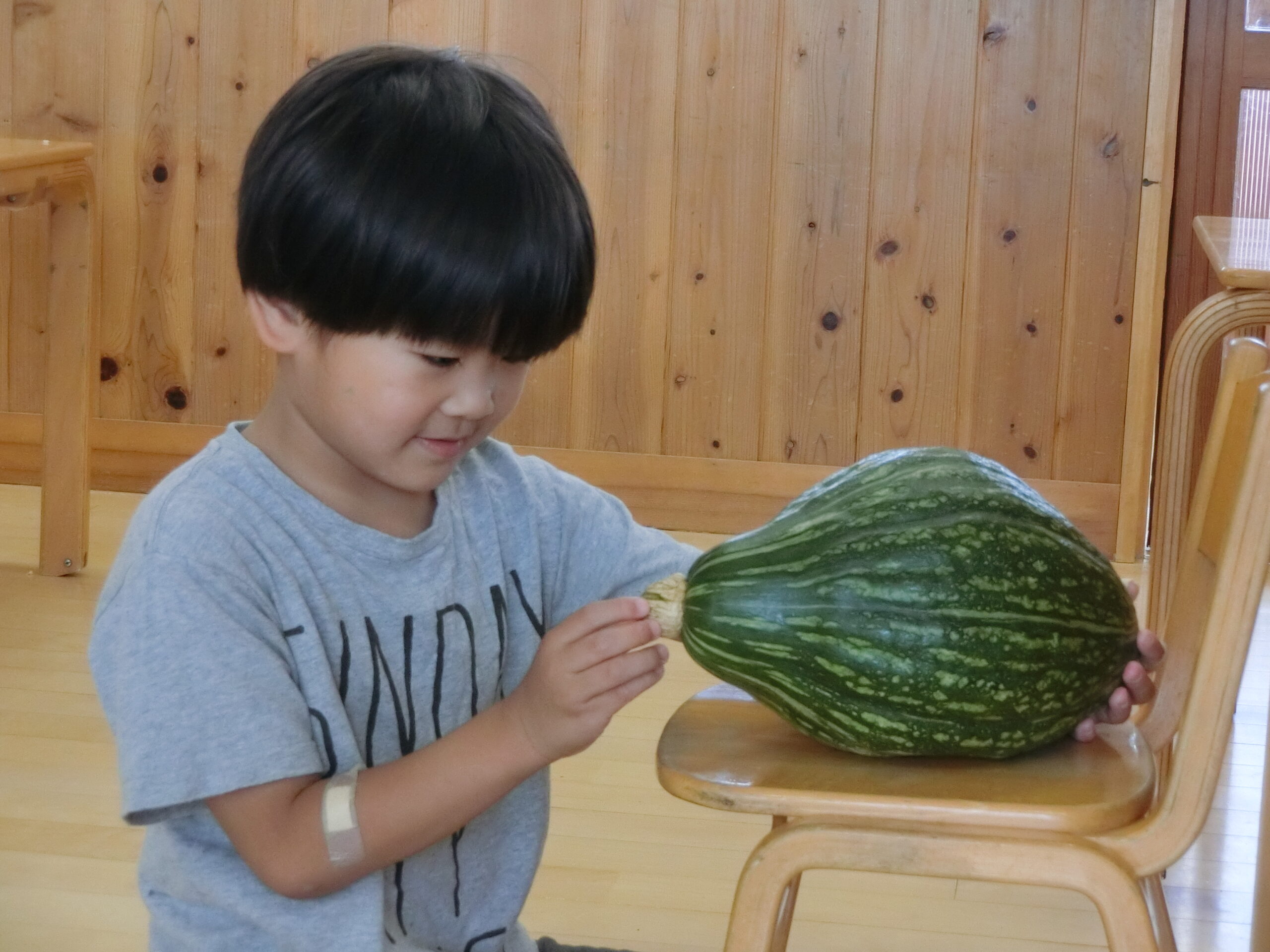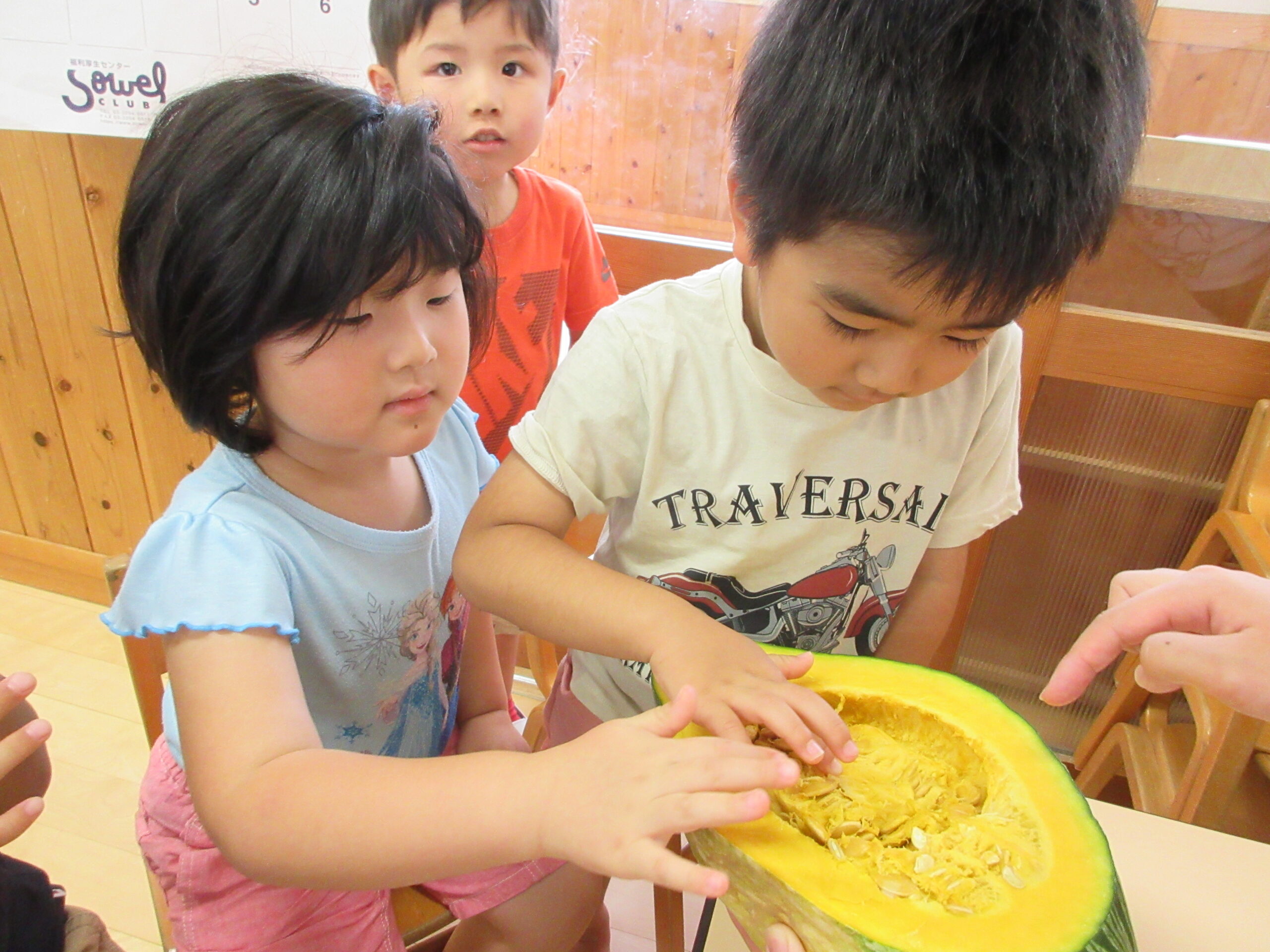 前日にかぼちゃの絵本を見ていたので実際に中身をみると、これが種だね。これがまたかぼちゃになるんだよね。と覚えたことを嬉しそうにお話してくれました。