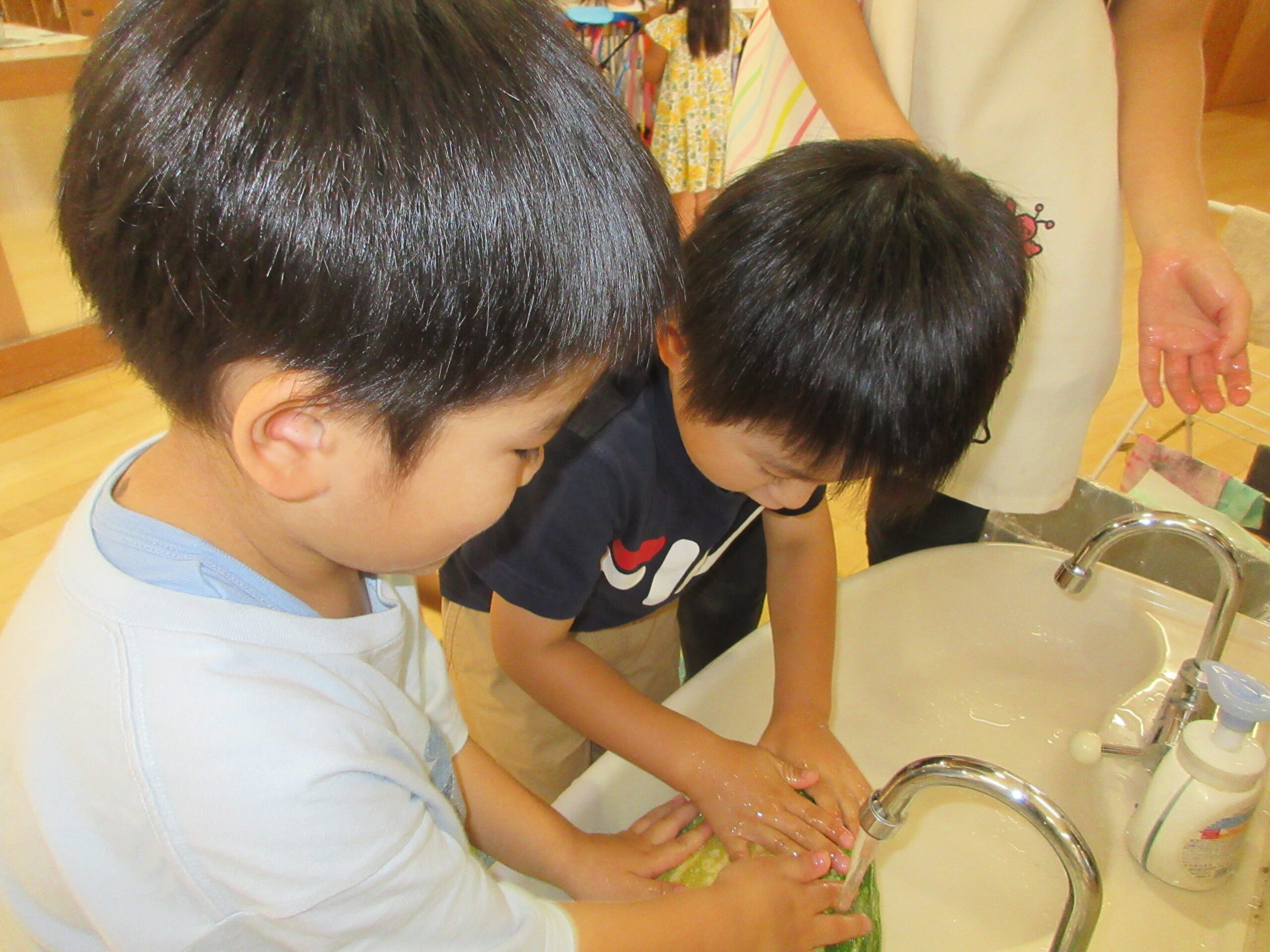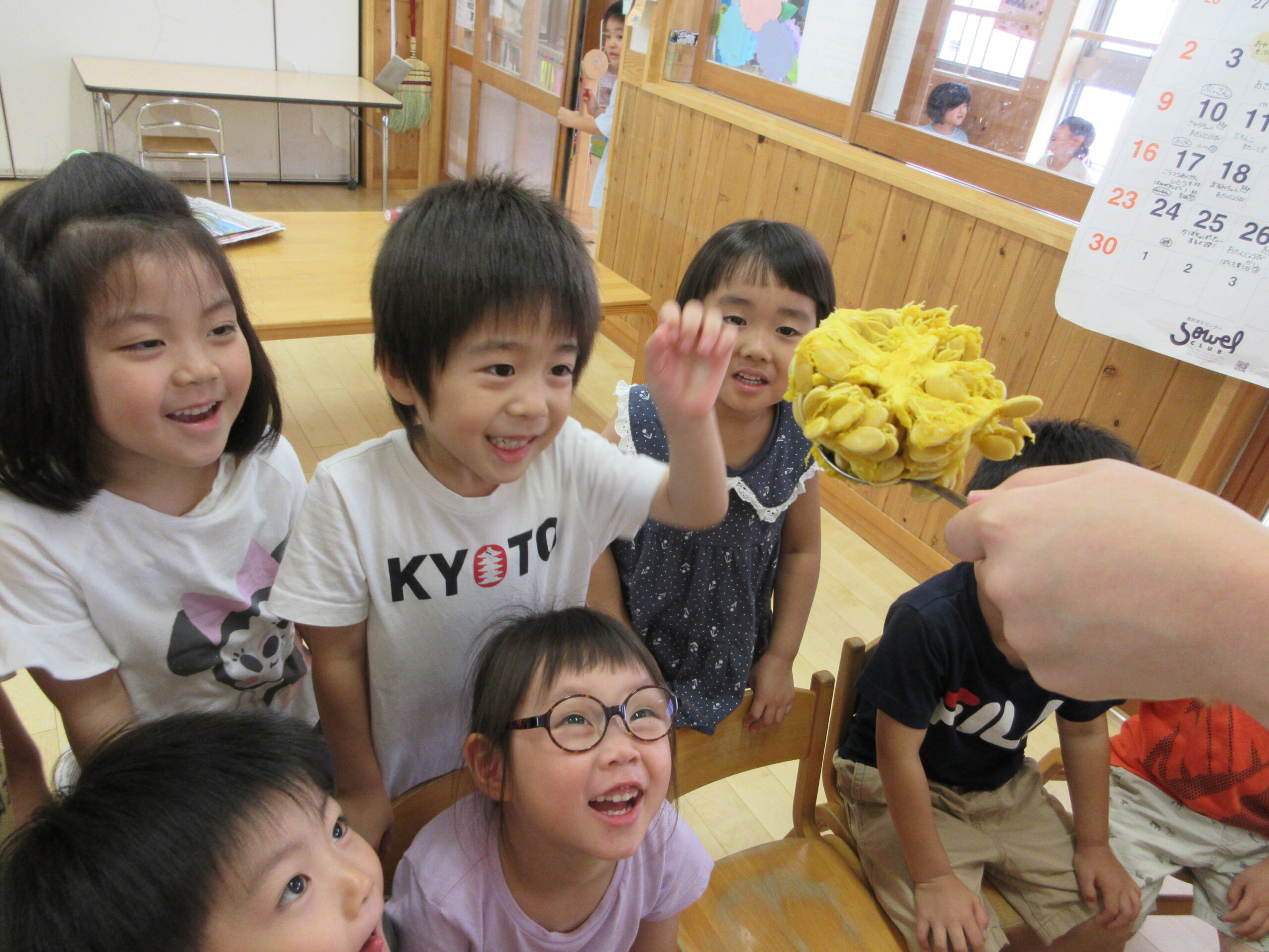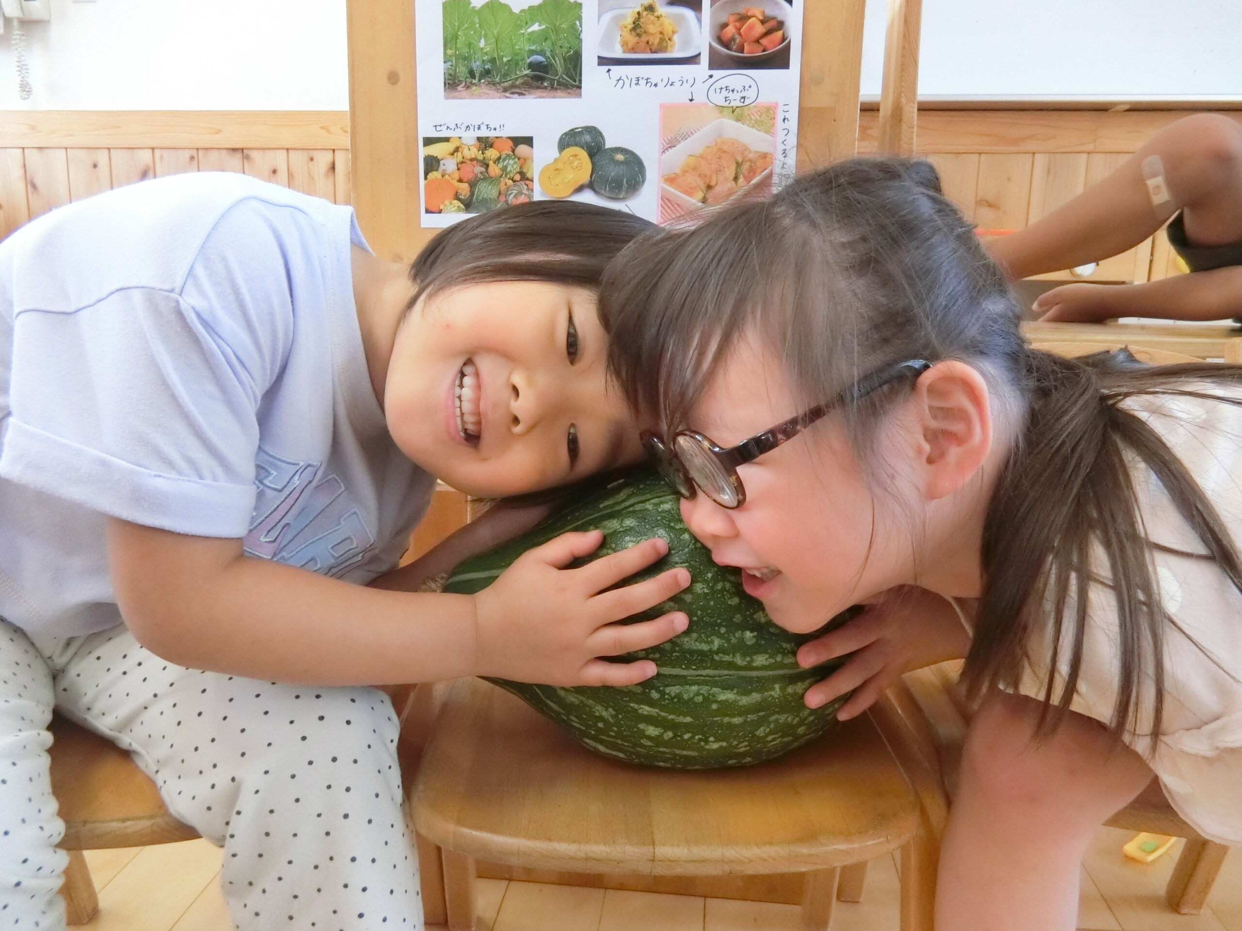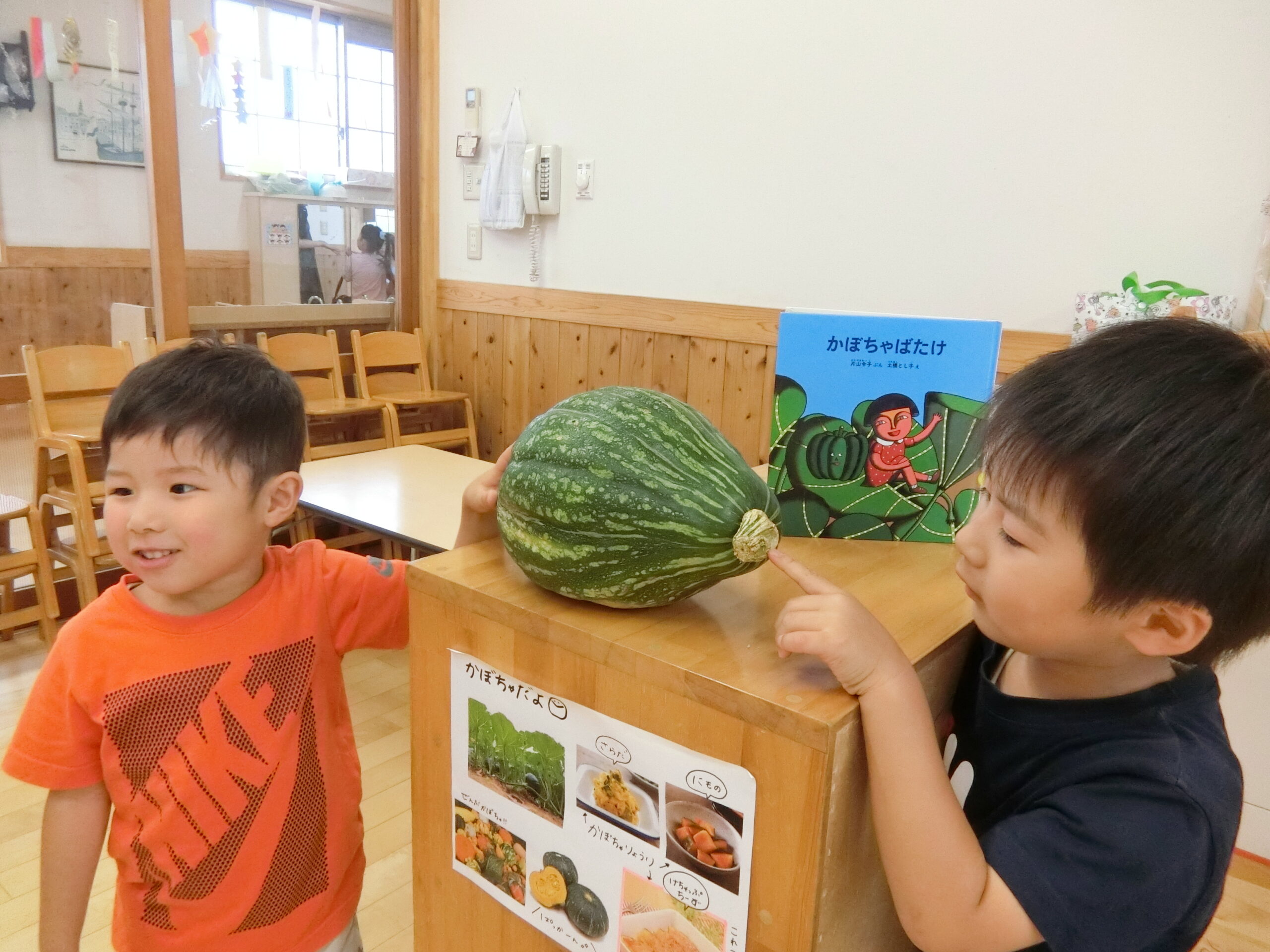 前日にかぼちゃの絵本を見ていたので実際に中身をみると、これが種だね。これがまたかぼちゃになるんだよね。と覚えたことを嬉しそうにお話してくれました。