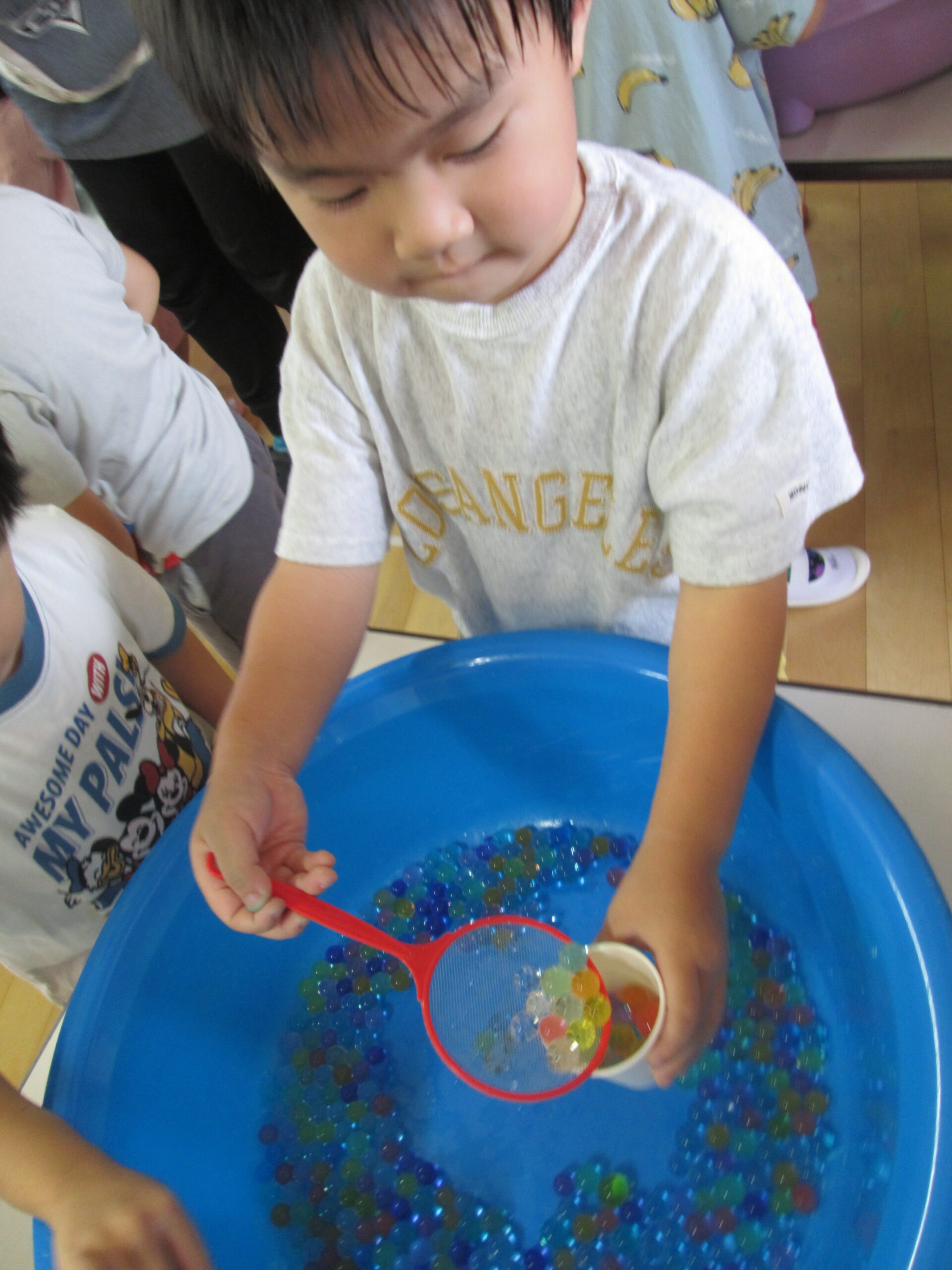 「赤色だけ集めよ!」「青だけにしようかな!」と色で分けてすくって楽しむ姿も😆