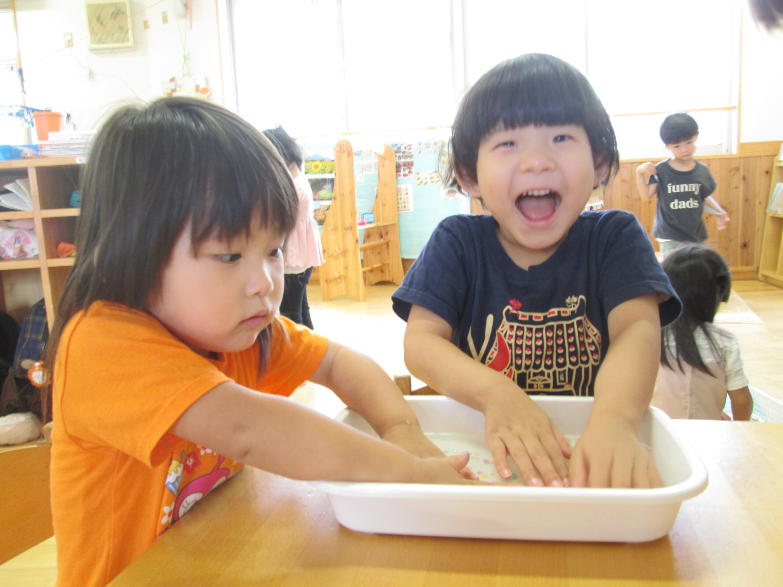 保育士が準備を始める前から、机に置いてある寒天を発見し「なにこれ!」「今日使うの!?」と興味津々😆