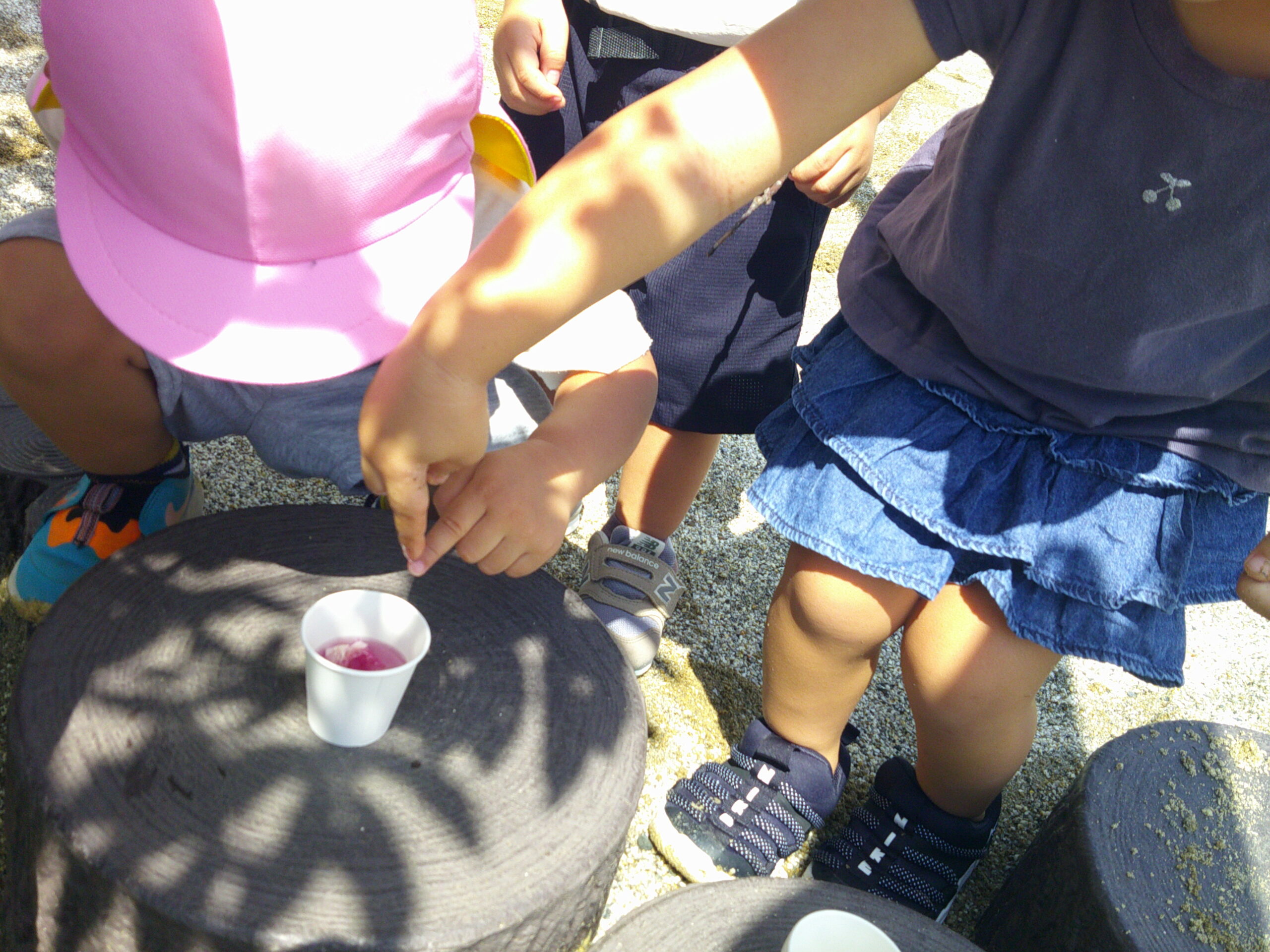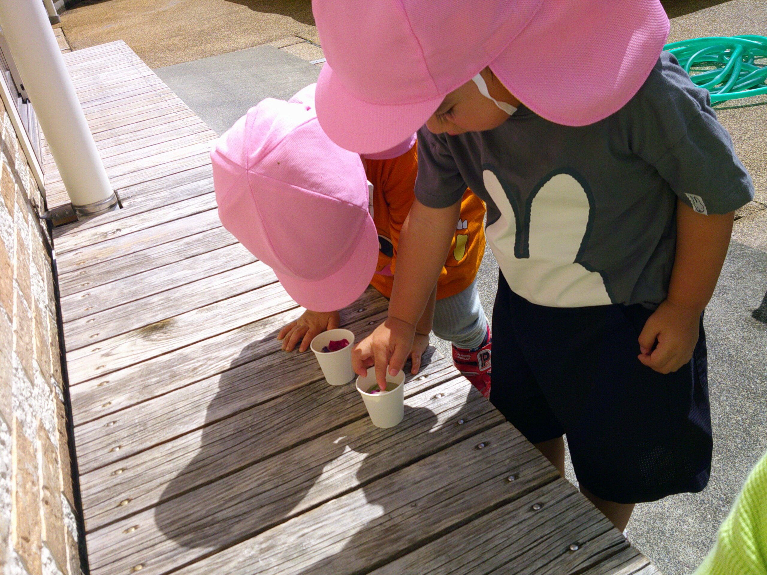 縁台に移動し、隣の友だちと言葉を交わし相談し合いながら、色水作り!