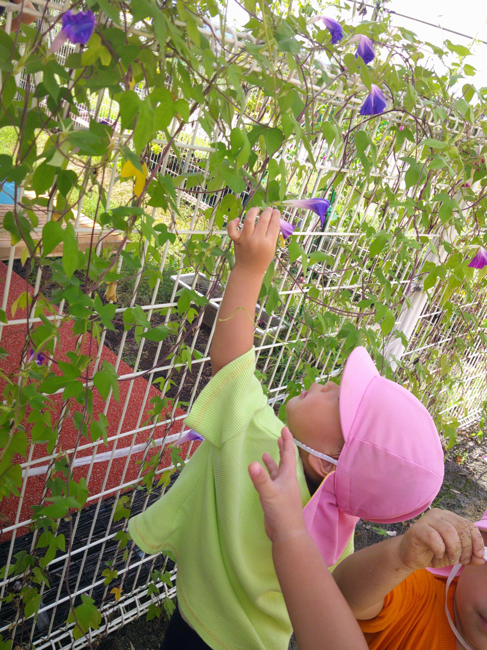 あさがおに手を伸ばしたら、昨年度の担任保育士と遭遇し、思わずにっこり笑い合い手を伸ばし合います😄